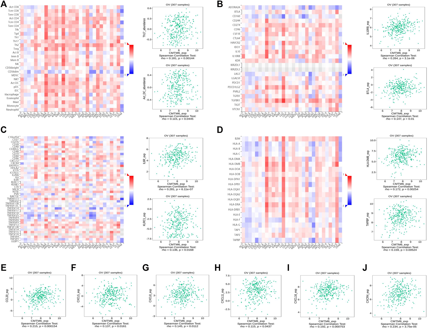CMTM6 expression was associated with immune infiltration in OV from the TISIDB database. (A–D) Spearman relations between the abundances of TILs (A), immunoinhibitors (B), immunostimulators (C), and MHC molecules (D); the top 2 are exhibited. The relationship of CMTM6 expression with (E–I) chemokines and (J) chemokine receptor.