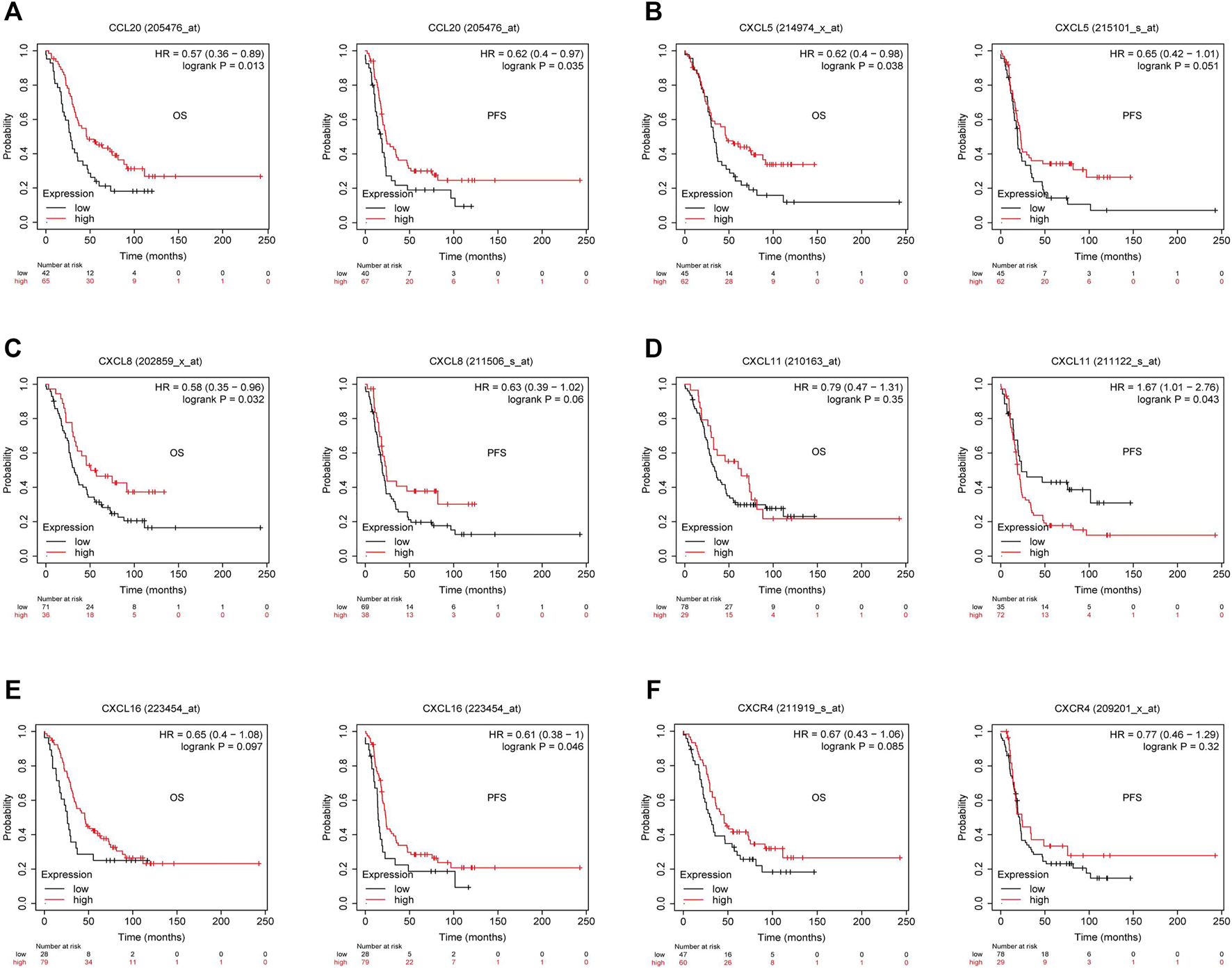 Kaplan–Meier survival curve comparison of the high and low expression of corresponding chemokines and chemokine receptor in GSE26193. (A–C) High CCL20, CXCL5, and CXCL8 had better survival in OV. (D) Relationship between CXCL11 expression and survival in OV. (E) Overexpressed CXCL16 had longer survival in OV. (F) Relationship between CXCR4 expression and survival in OV (p < 0.05).