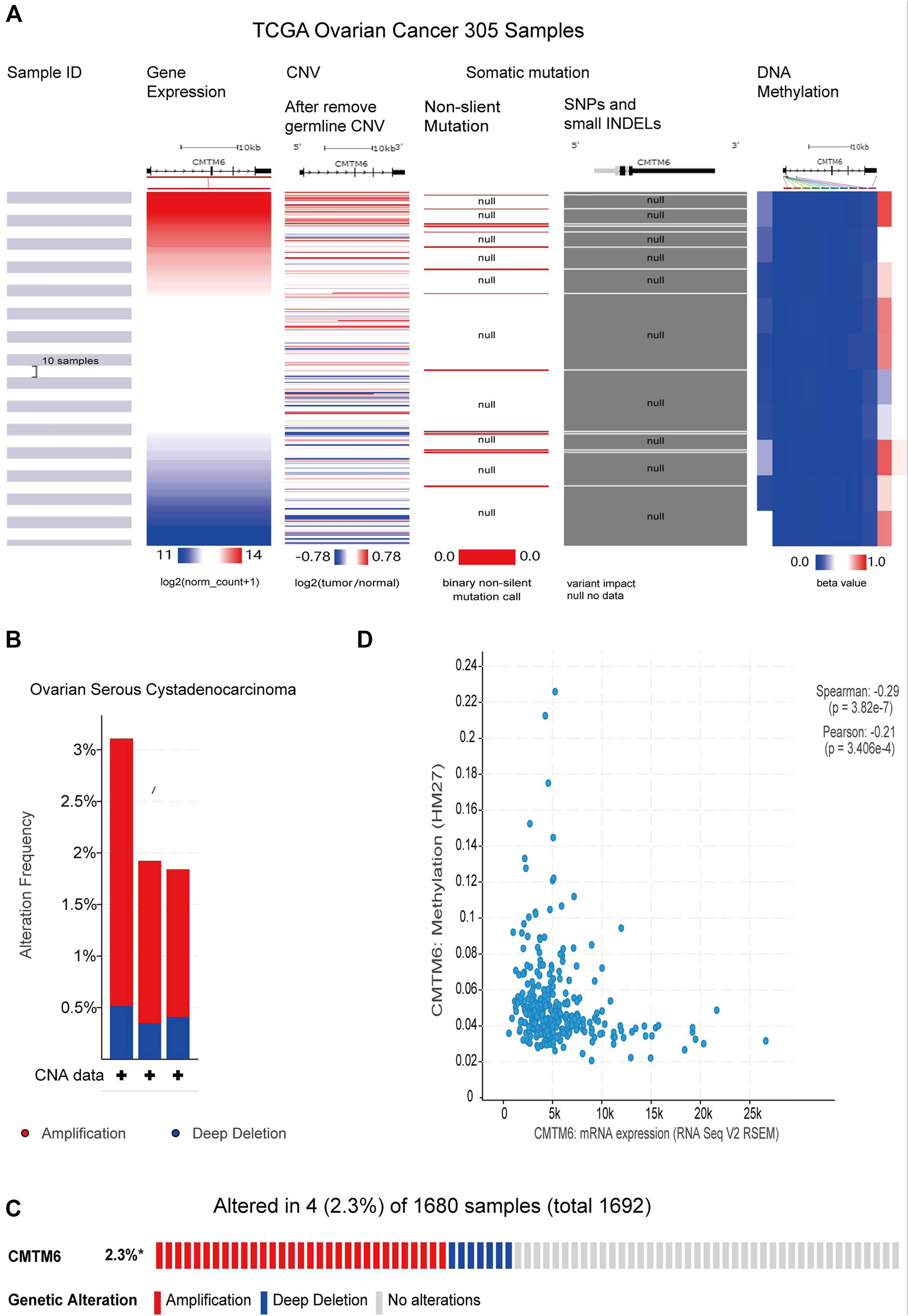 The genomic alteration types, alteration frequency, and CMTM6 mRNA level vs. methylation in OV were analyzed through the “OncoPrint” and “Plots” module, and the survival situation of the altered group or not were analyzed by the “Comparison/Survival” module in cBioPortal (Gao et al., 2013).