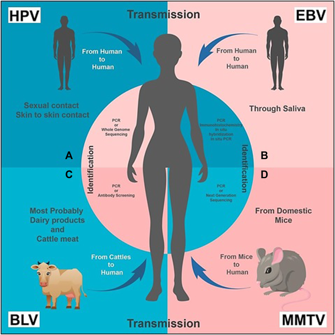 Transmission and Identification of the viruses, respectively: (A) HPV transmission takes place from human to human through sexual and/or skin to skin contact. It can be diagnosed by PCR (recommended) or Whole Genome Sequencing. (B) EBV is transmitted through saliva from human to human. Its presence can be identified by PCR, immunohistochemistry, in situ hybridization and in situ PCR. (C) BLV transmission primarily takes place from bovine or cattle (usually domestic animals) to humans; dairy and cattle meat can also be a source of transmission. PCR or antibody screening of a human blood sample is carried out for its diagnosis. (D) MMTV is transmitted from mice to human. Its presence is identified by PCR or NGS.
