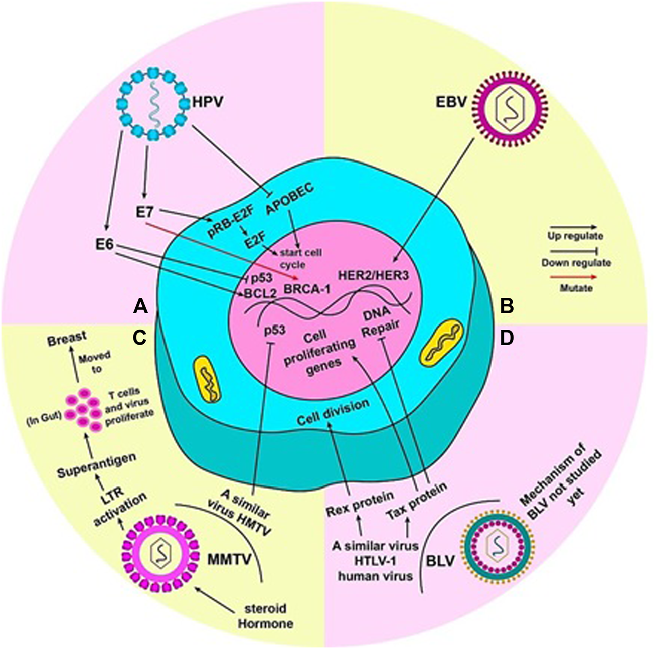 Mechanism by which each virus is said to cause breast cancer: (A) When mutated, oncoproteins (E6 and E7) of HPV virus activate pro-tumor genes. E6 activates BCL2 and inhibits p53, thus, promoting cell division. The pRB-E2f complex inhibits cell cycle; E7 detaches E2f from pRB and E2F alone commences the cell cycle. Mutation of BRCA-1 gene by E7 can also lead to tumor development. HPV also inhibits APOBEC (a cell cycle inhibitory molecule) to start cell cycle and cause genome instability. (B) EBV can activate HER2/HER3 gene(s) to render cell towards uncontrolled division. (C) Steroid hormones lead to efficient replication and increased expression of MMTV genome. An LTR in the MMTV genome codes for superantigens which activate T lymphocytes. MMTV replicates rapidly in these T cells in the gut, during which it can be carried to the breast. HMTV, a virus similar to MMTV, can inhibit p53 to induce to cell cycle. (D) The true mechanism by which BLV causes cancer in humans has not been yet studied. However, HTLV-1, a virus similar to BLV present in humans, can lead to uncontrolled cell division by the production of Rex and Tax proteins. Tax protein accentuates this by activating cell proliferating genes and halting DNA repair mechanism of the cell.