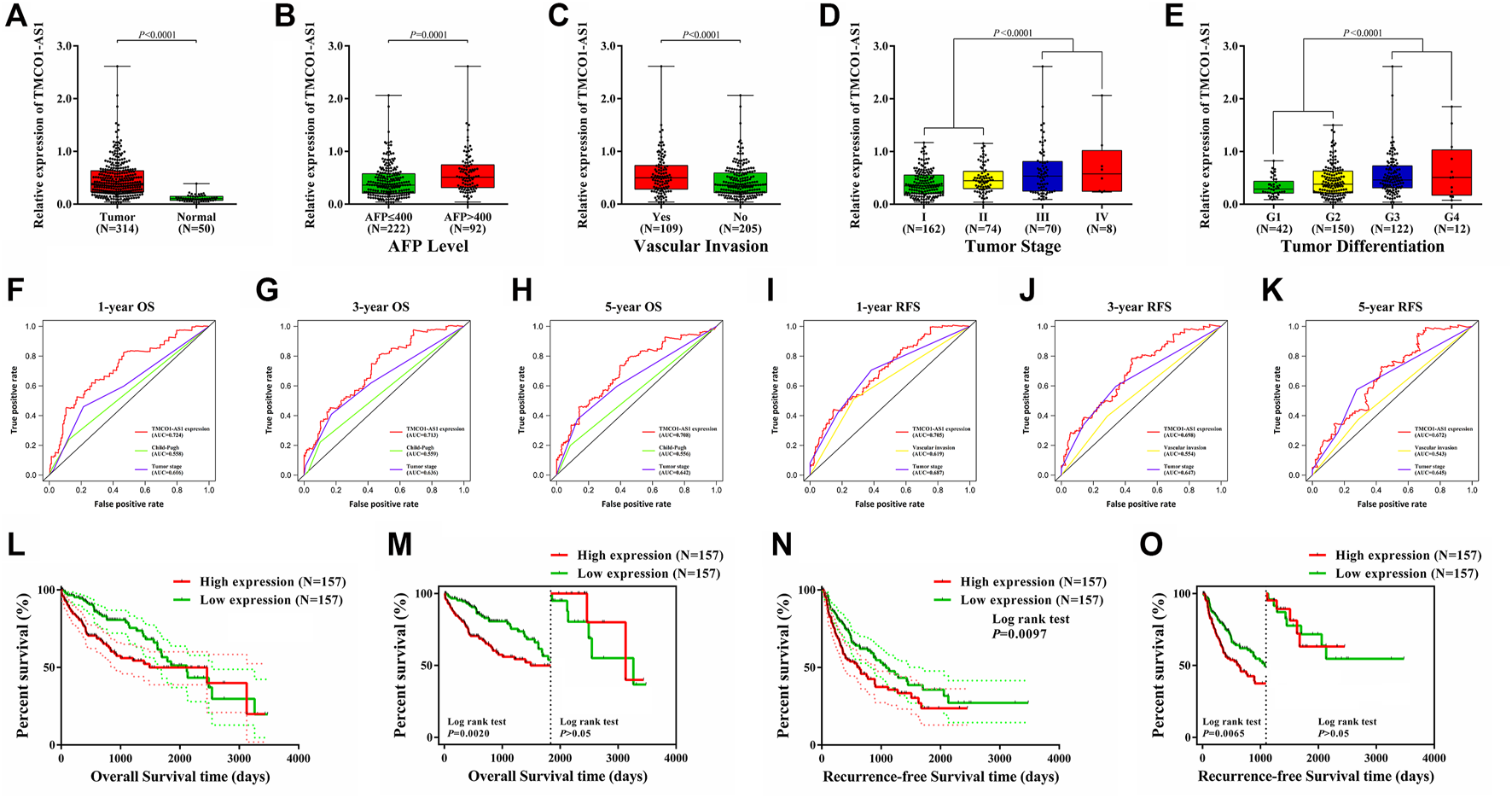 Dysregulation of TMCO1-AS1 in HCC and its prognostic significance for HCC using data of patients from TCGA. (A) The expression levels of TMCO1-AS1 in HCC and adjacent normal tissues. (B) TMCO1-AS1 expression in patients with high (AFP >400 μg/L) and low (AFP ≤400 μg/L) serum AFP levels. (C) TMCO1-AS1 expression in patients with and without vascular invasion. (D) TMCO1-AS1 expression in patients with different tumor stages. (E) TMCO1-AS1 expression in patients with different degrees of tumor differentiation. (F–H) Time-dependent ROC curves of the relations of clinical characteristics and 1-/3-/5-year OS. (I–K) Time-dependent ROC curves of the relations of clinical characteristics and 1-/3-/5-year RFS. (L) Kaplan-Meier curves for OS of HCC patients from TCGA with high and low TMCO1-AS1 expression. (M) Landmark analysis discriminating between OS before and after 5 years of follow-up. (N) Kaplan-Meier curves for RFS of HCC patients from TCGA with high and low TMCO1-AS1 expression. (O) Landmark analysis discriminating between RFS before and after 3 years of follow-up.