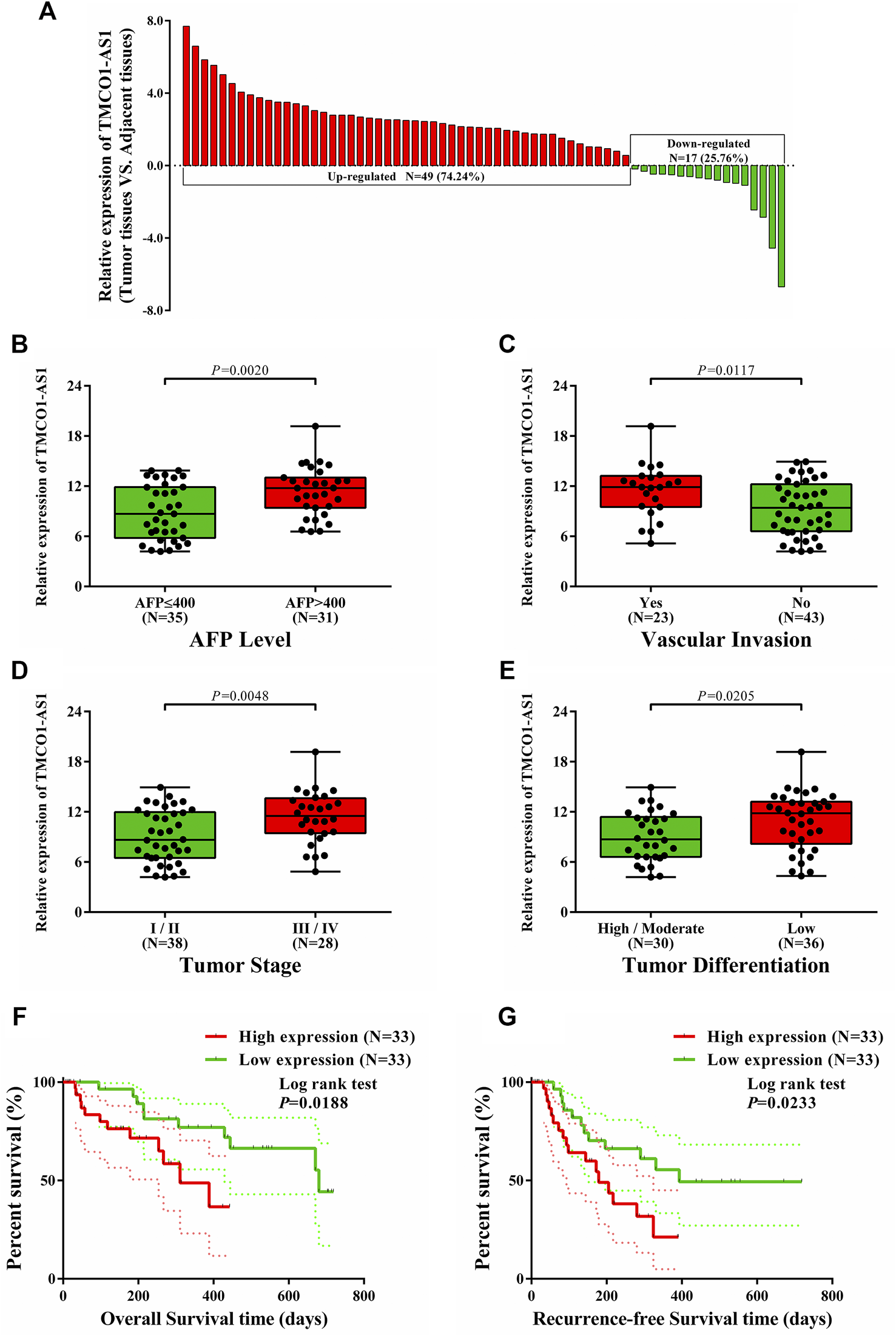 Relations between TMCO1-AS1 expression and clinical characteristics of HCC patients treated at our center. (A) Relative expression of TMCO1-AS1 in 66 HCC and adjacent normal tissues. (B) TMCO1-AS1 expression in patients with high and low serum AFP levels. (C) TMCO1-AS1 expression in patients with and without vascular invasion. (D) TMCO1-AS1 expression in patients with different tumor stages. (E) TMCO1-AS1 expression in patients with different degrees of tumor differentiation. (F) Kaplan-Meier curves for OS of patients with high and low TMCO1-AS1 expression. (G) Kaplan-Meier curves for RFS of patients with high and low TMCO1-AS1 expression.