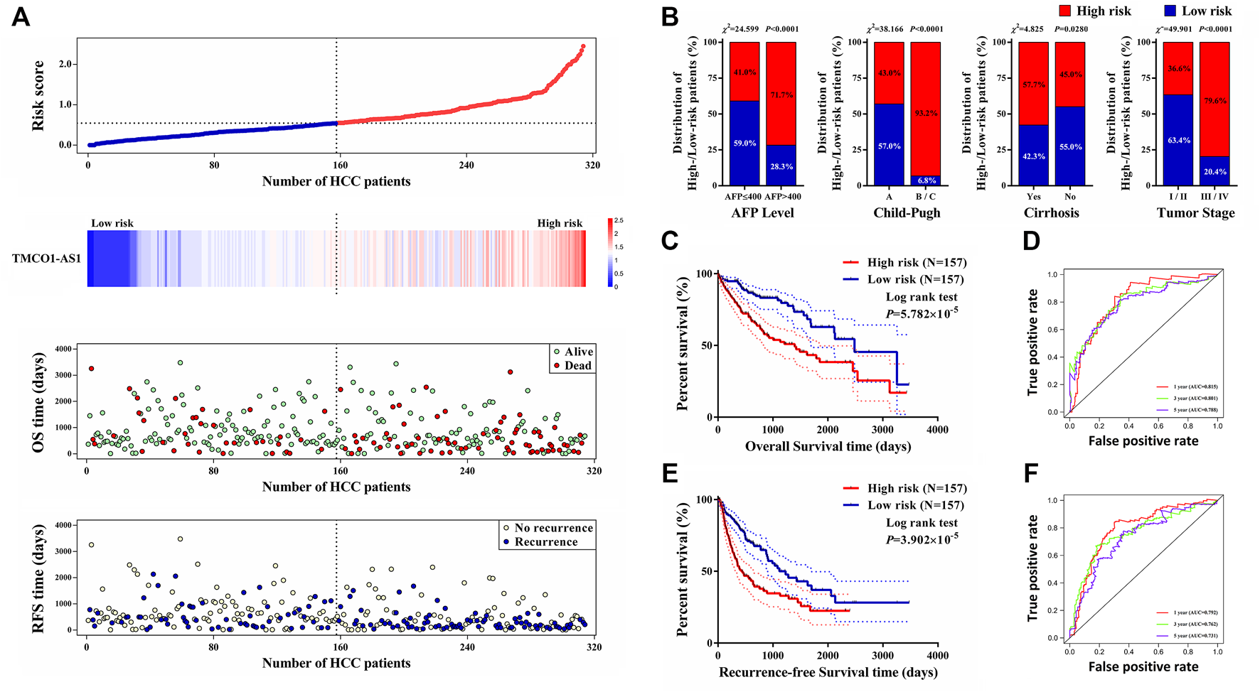 Supplementary Figure 1A prognostic model for OS and RFS of HCC patients from our center. (A) Risk score distribution, TMCO1-AS1 expression, and OS and RFS of patients in the high- and low-risk group. (B) Comparison of the distributions of patients with different characteristics in the high- and low-risk groups. (C) Kaplan-Meier OS curves for patients in the high- and low-risk groups. (D) Kaplan-Meier RFS curves for patients in the high- and low-risk groups.