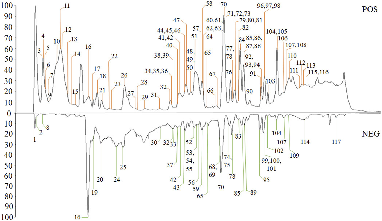 The TIC chromatograms of HJP from UPLC/Q-TOF-MSE analysis.