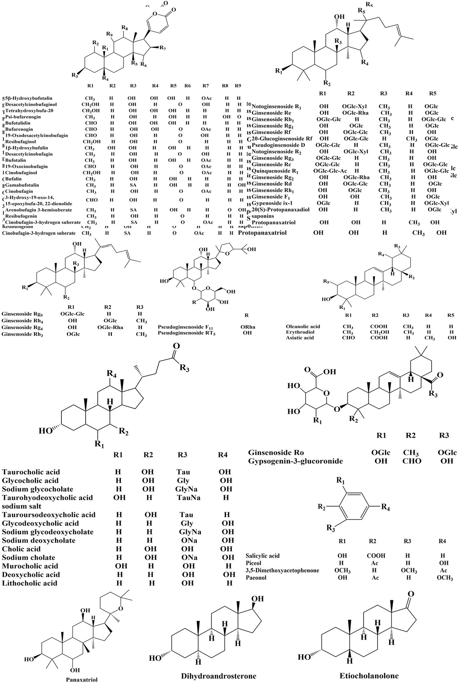 The high-resolution MS data of HJP were obtained by UPLC-Q-TOF/MSE. The total ion chromatography (TIC) of HJP in positive and negative ion modes is shown in Figure 1. The UNIFI screening platform was used to analyze the collected MSE data, and the mass error and responsivity were investigated by automatically matching ion fragments. After standard comparison, literature review and further manual verification, a total of 117 compounds in HJP were identified or tentatively characterized. They were classified by ingredient sources, including 32 triterpenoid saponins, 13 bile acids, 22 bufadienolides, etc. Then, the detailed MS information of these components was summarized in Table 1. In addition, we tentative confirmed the structures of these compounds based on accurate mass, MSE data, and related literature. The compounds with the same core structure were classified, such as dammarane type and oleanane type. Finally, the structure of the main chemical components in HJP is shown in Figure 2.