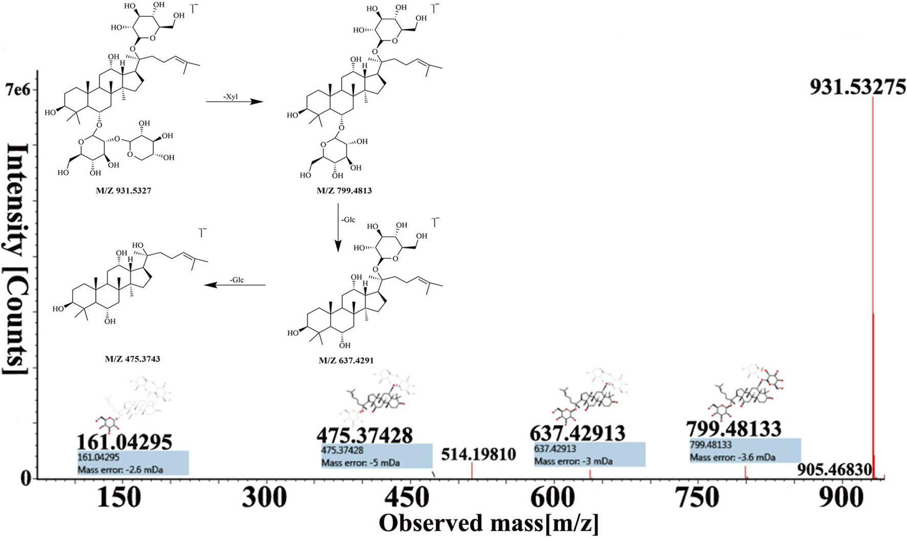 | 27 | C41H68O13 | 10.13 | 783.4872 | −2.1 | 783.4872 [M + H]+ | Ginsenoside La | a |