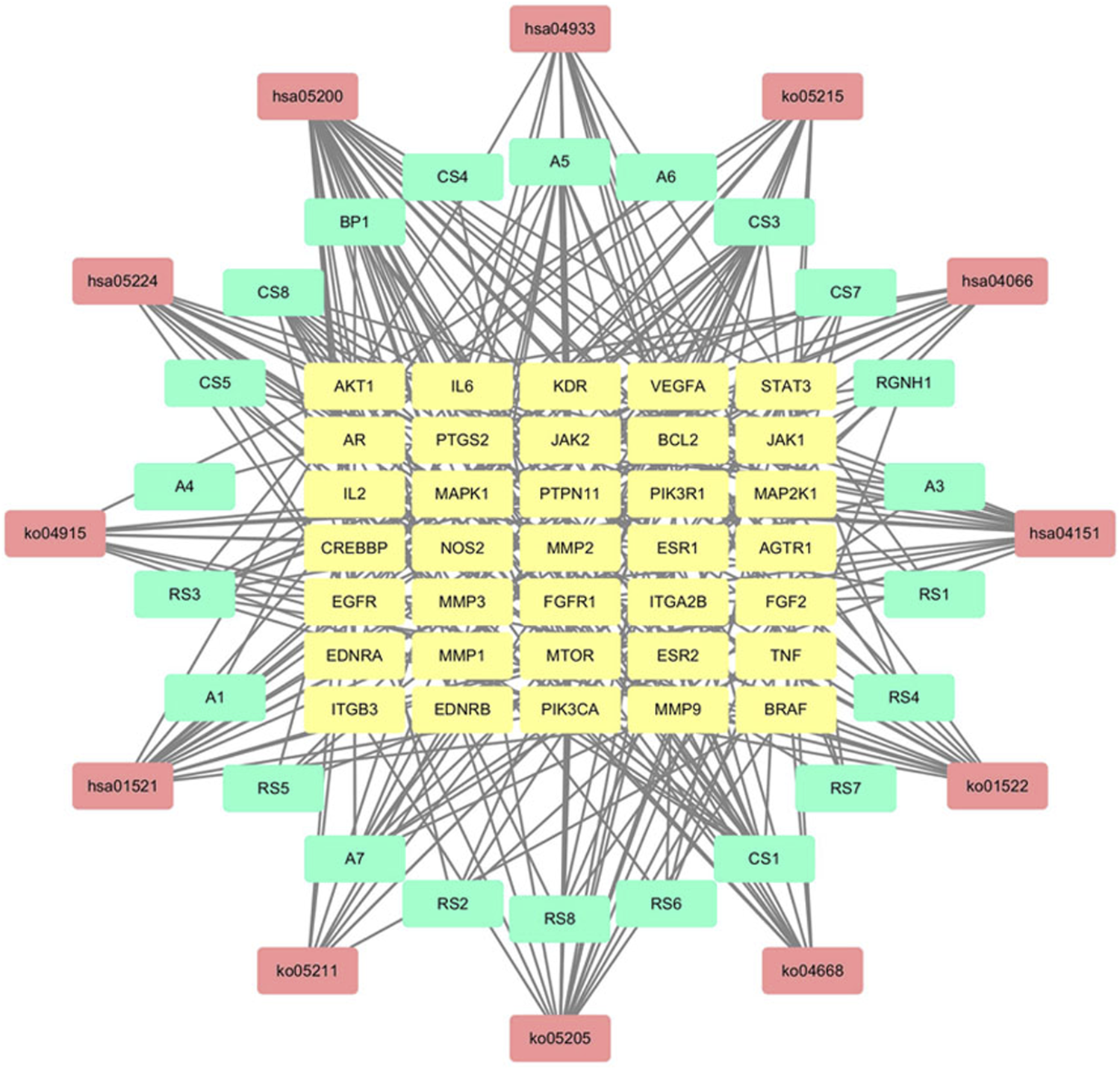 The targets were retrieved from the prediction of the online target platform Swiss Target Prediction5. “Homo sapiens” was the restrictor for target prediction. And the targets with a probability of more than 0.1 were collected. Meanwhile, the CVDs-related targets were obtained from the Gene cards database6. The Online Venn figure platform7 was used to get the Venn figure and HJP with CVDs intersection of targets. Cytoscape software (version 3.2.1) was applied to construct the chemical-target and protein-protein interactions (PPIs) networks. All proteins/genes were subjected to pathway enrichment analysis (GO and KEGG analysis) using the Metascape databases8. Those pathway terms with a p-value less than 0.05 were regarded as significant.