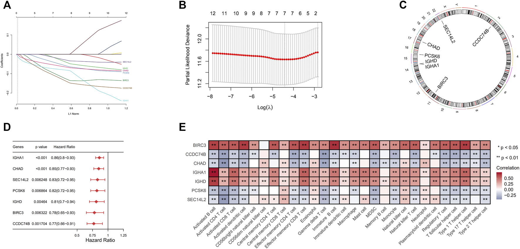 (A) The optimal penalty parameter values were confirmed by 1,000 round cross-validation. (B) Seven hub genes related to prognosis were analyzed by LASSO Cox analysis. (C) Each of seven genes on chromosomes was shown in Circos plots. (D) The contribution made by each of the seven genes to survival differences. (E) Correlation matrix of immune cell infiltration and the expression levels of seven immune-associated genes.