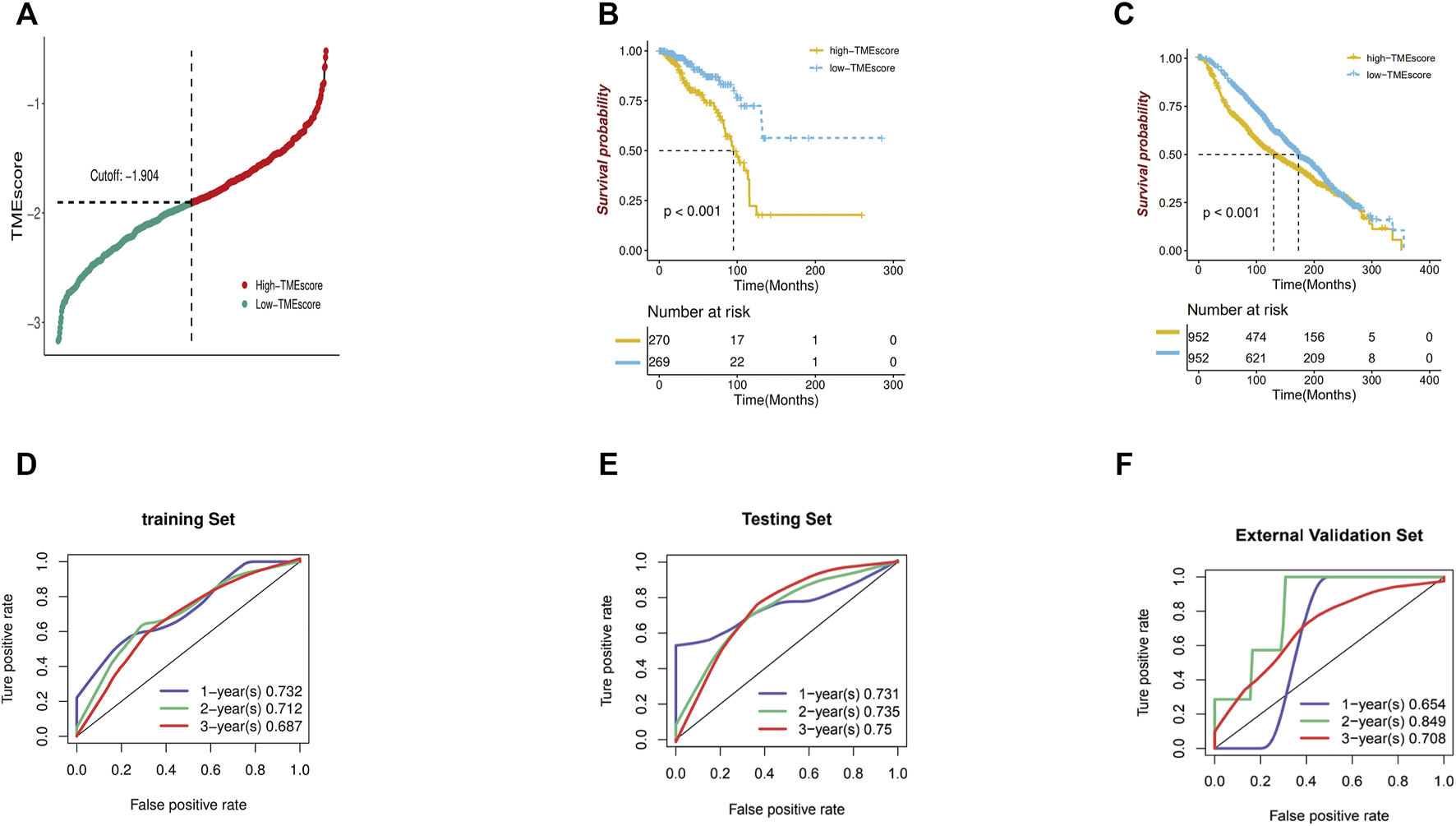 (A–C) The TME score and Kaplan-Meier curve analysis of seven immune-associated gene signature in TCGA-BRCA and METABRIC cohort. (D–F) ROC curves measuring the predictive values of the TME score at 1, 2, and 3 years in overall, training and external validation set, respectively.