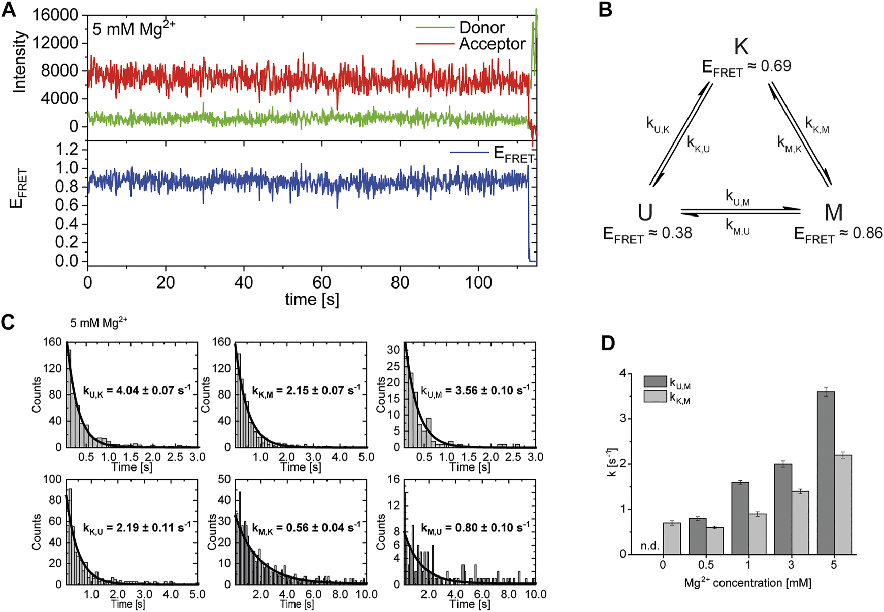 After identification and structural description of the three states U, K and M we characterized the transitions between these states. To this end, we performed time resolved smFRET measurements and observed the behavior of the molecules over several minutes at different Mg2+ concentrations in the absence of Gdm+. While some of the traces remained in one FRET state throughout the measurement (example in Figure 5A), the majority of molecules showed multiple transitions, in which each of the states was accessible directly from every other state. We isolated FRET data prior to photobleaching for each molecule and stitched these traces together to a single FRET trace up to 50,000 datapoints (Supplementary Figure S9). From these stitched traces, we performed hidden Markov Modelling using the HaMMy software (McKinney et al., 2006) with a three state model (Figure 5B). We were able to extract kinetic information (Table1) about the fast-transitioning molecules. For this we plotted the dwell times and fitted a mono-exponential function to derive rate constants (Figure 5C).
