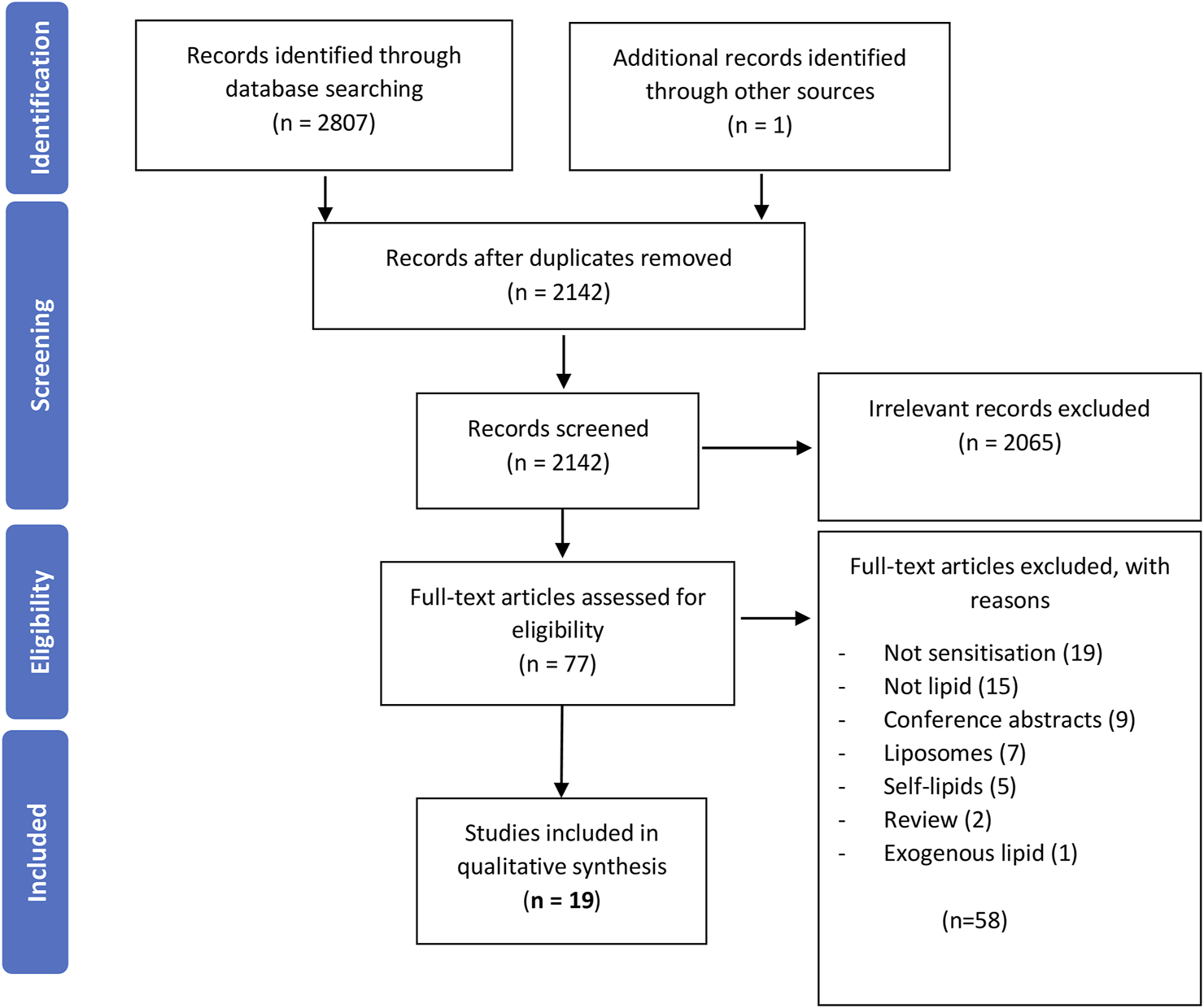 A PRISMA 2009 flow chart detailing the process of study selection. Publications were sought from three databases, duplicates removed, records screened for relevance, full-texts of the remaining articles evaluated for their eligibility, and the remaining studies were grouped into three different categories. This review focuses on the 19 studies investigating the role of lipids in sensitization.