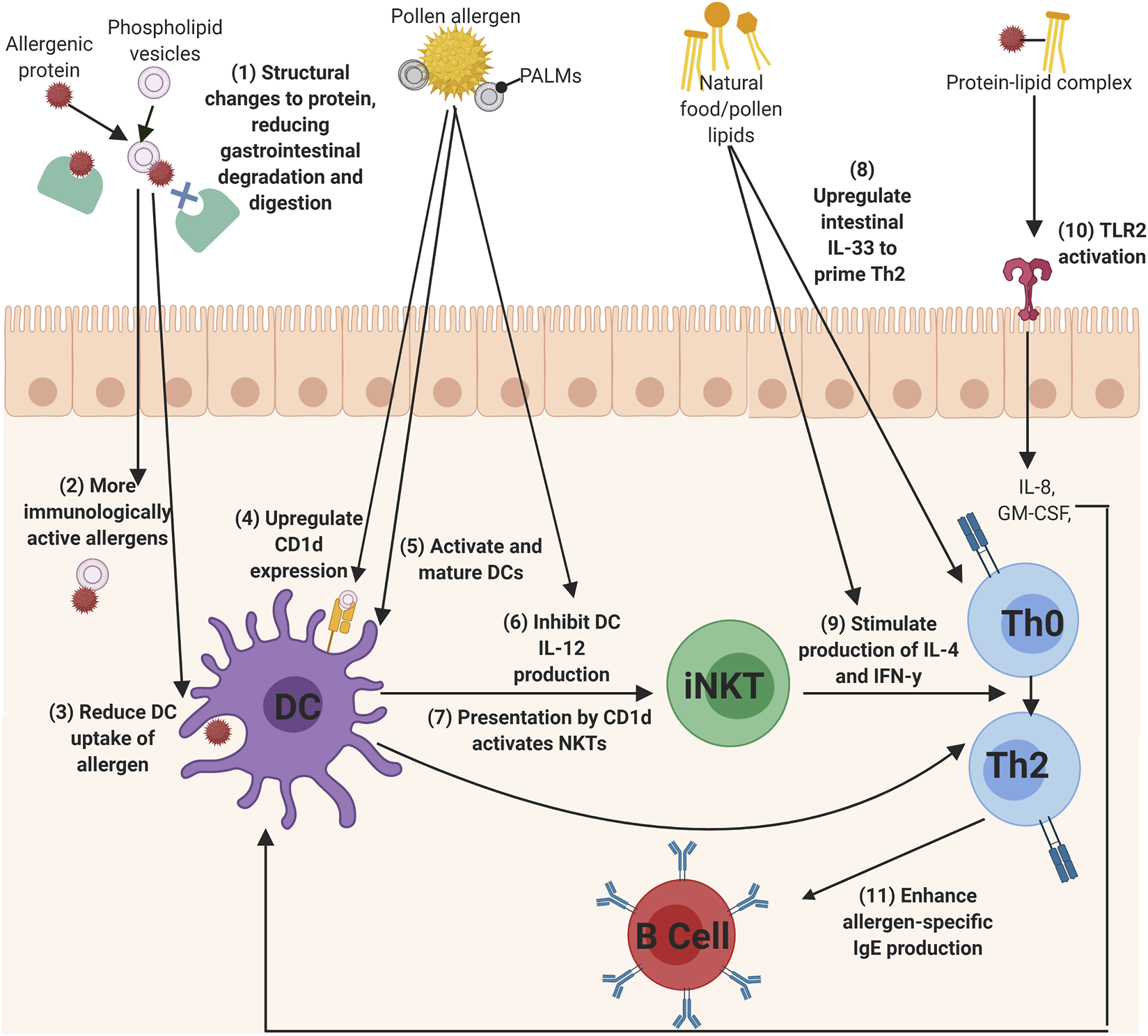Results: The results provide strong evidence for the role of lipids in allergies. Intrinsic lipids from allergen sources can interact with allergenic proteins to predominantly enhance but also inhibit allergic sensitization through various mechanisms. Proposed mechanisms included reducing the gastrointestinal degradation of allergenic proteins by altering protein structure, reducing dendritic cell (DC) uptake of allergenic proteins to reduce immune tolerance, regulating Th2 cytokines, activating invariant natural killer T (iNKT) cells through CD1d presentation, and directly acting upon toll-like receptors (TLRs), epithelial cells, keratinocytes, and DCs.