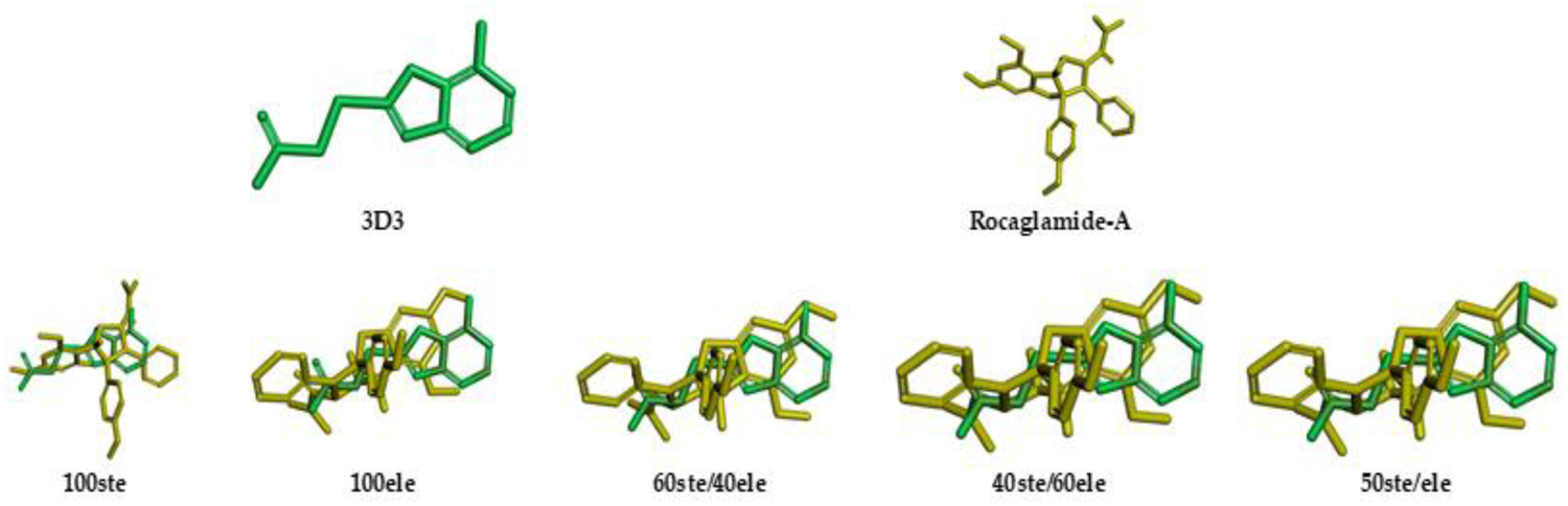 Representations of overlap similarities between molecular structures of 3D3 ligand (green) and Rocaglamide-A (yellow) according to different steric/electrostatic contributions.