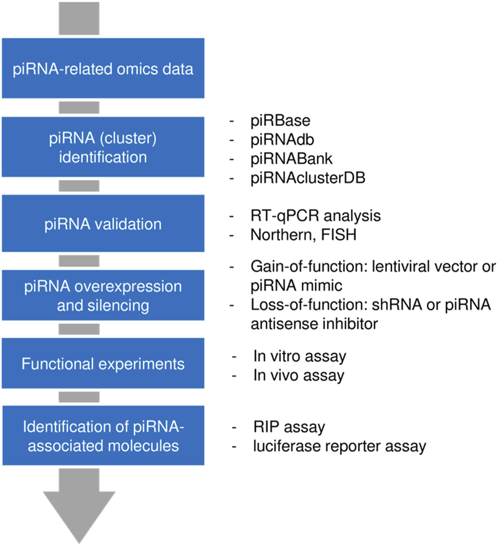 Workflow for piRNA discovery and analysis. First, a candidate piRNA was identified from a pool of RNAs through high-throughput approaches. After validation, gain-of-function or loss-of-function models were generated and the functional impact of a piRNA was assessed. By using pulldown assay or reporter assay, those molecules that interact with piRNAs (proteins or RNAs) could be determined.