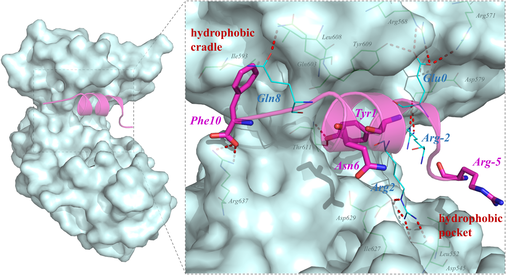 Among unphosphorylated peptides, Asp (MAP1A) or Glu (QSF) mimicking the p-Ser of phosphorylated peptides formed crucial hydrogen bond interactions with R568GK, Y580GK, and Y609GK of the phosphor-site. Similarly, the hydrophobic interactions were also important for the binding interaction of unphosphorylated peptides.