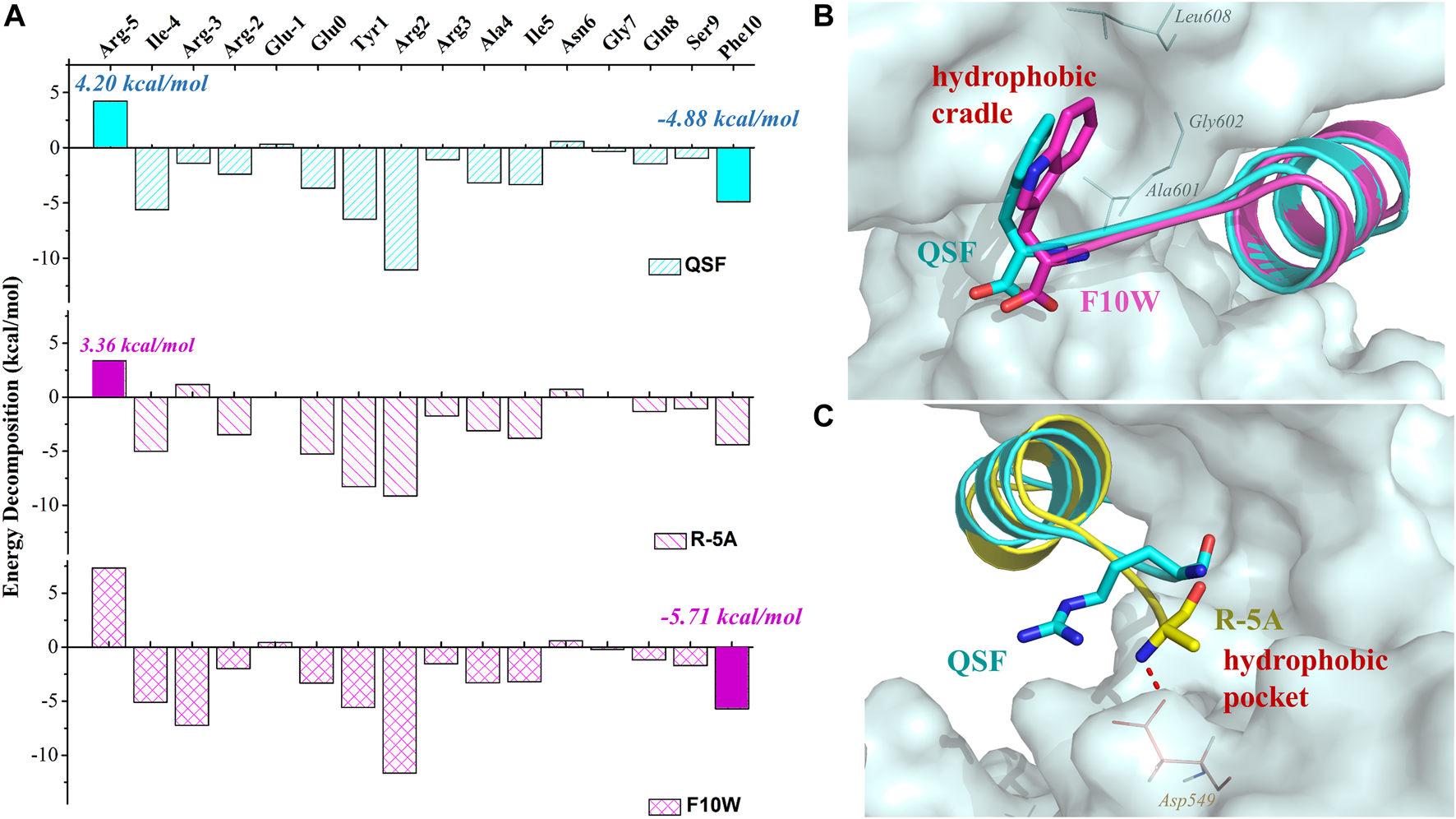 FIGURE 4. (A) Binding free energy decomposition of QSF, R (-5) A, and F10W systems. (B) Superposition of the MD equilibrium conformations of QSF and F10W. (C) Superposition of the MD equilibrium conformations of QSF and R (-5)A. The hydrogen bond was shown in red dashed line.