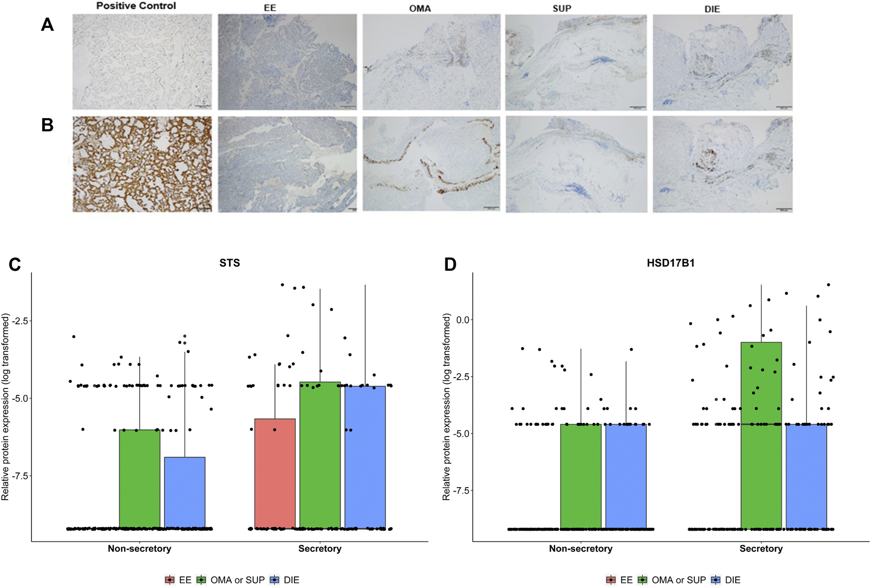 Representative images from STS(A) and HSD17B1(B) protein expression in endometriotic samples and positive control (placenta) analyzed by immunohistochemistry. Protein tissue expression levels of STS(C) and HSD17B1(D) in eutopic endometrium from endometriosis patients (EE), ovarian (OMA), superficial (SUP), and deep-infiltrating (DIE) lesions. Samples were divided into a nonsecretory and secretory phase of the menstrual cycle. Bars represent the log10 mean fold change of the relative protein expression, accompanied by the 95% CI.