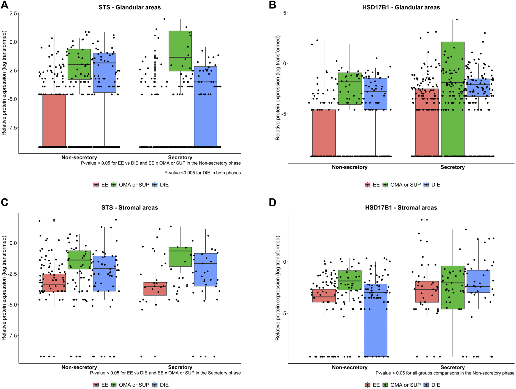 However, when areas of sections were analyzed for STS protein expression, OMA/SUP and DIE groups had (Supplementary Figure S1), in the glandular areas, higher values than in eutopic endometrium from patients (EE) at both menstrual cycle phases (Figures 6A,B). In the stromal areas, again OMA/SUP (p = 0.018) and DIE (p = 0.012) groups had circa two-fold higher values for STS expression than EE. In contrast, HSD17B1 was present in the glandular and stromal areas, but differences between groups of circa two-fold were detected only at nonsecretory-phase samples for OMA/SUP (p < 0.001) or DIE (p = 0.012) vs. EE (Figures 6A,B).