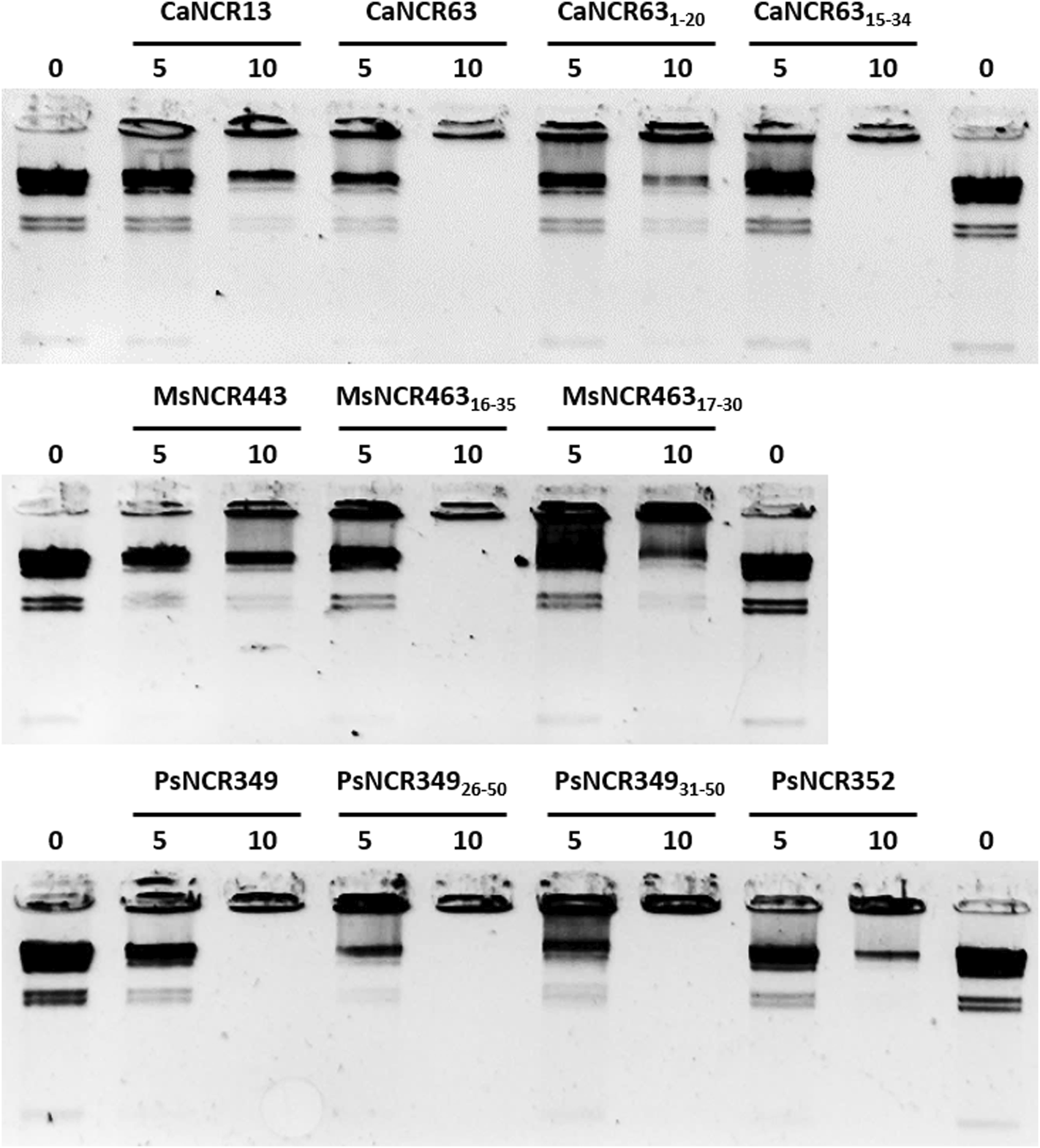 Aggregation of DNA by NCR peptides. Lambda HindIII digested DNA was incubated without (0) or with NCR peptides at 5 or 10 μM concentration.