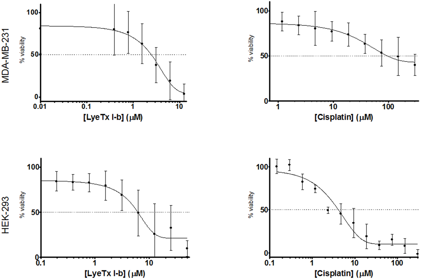 LyeTx I-b and cisplatin treatments induced cytotoxicity in a concentration-dependent manner (Figure 1) against MDA-MB-231 (triple-negative breast cancer cells) and HEK-293 (fetal kidney cells). The IC50 values of LyeTx I-b were 2.47 µM against MDA-MB-231 and 7.88 µM against HEK-293. The IC50 values of cisplatin were 94.69 and 3.96 µM against MDA-MB-231 and HEK-293, respectively.