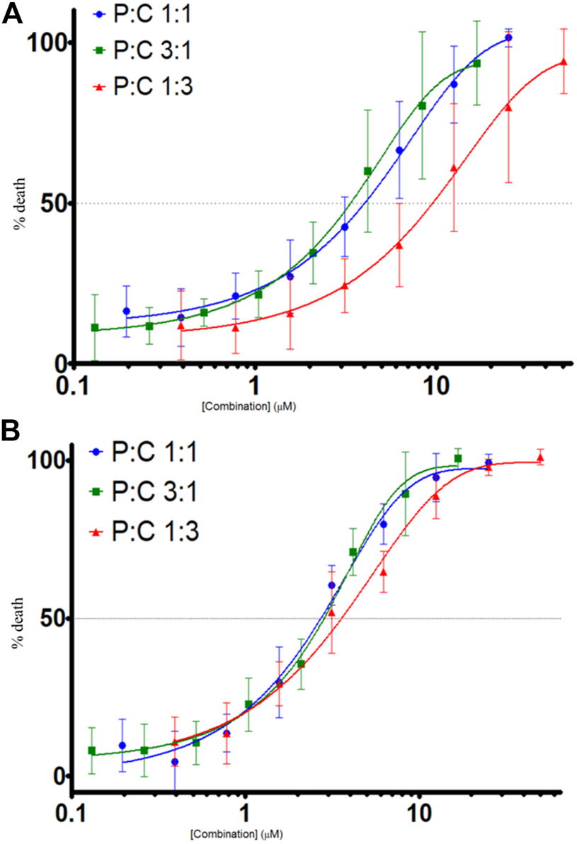 The proportions of LyeTx I-b and cisplatin (P:C = 1:1, 3:1, and 1:3) were evaluated against MDA-MB-231 and HEK-293 cells, resulting in concentration-dependent curves (Figure 2) for each proportion. These curves were made using the following equation: % death = 100%–% viability. The IC50 values found for each treatment against the cells and the SI values are shown in Table 2.