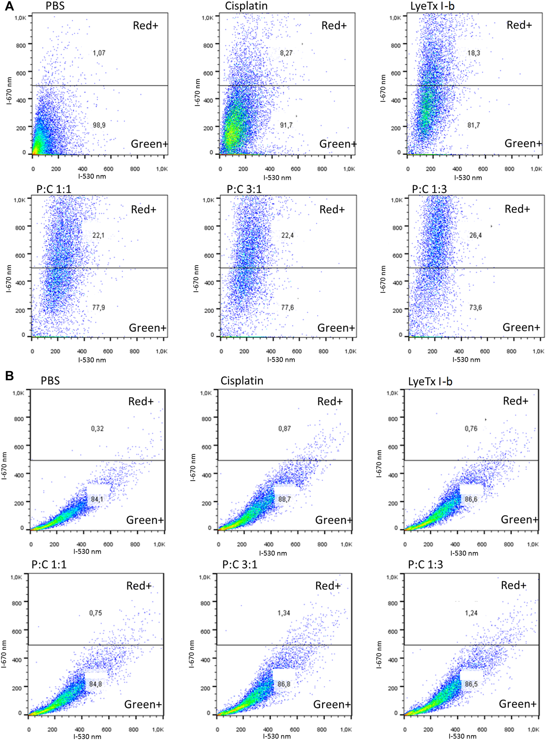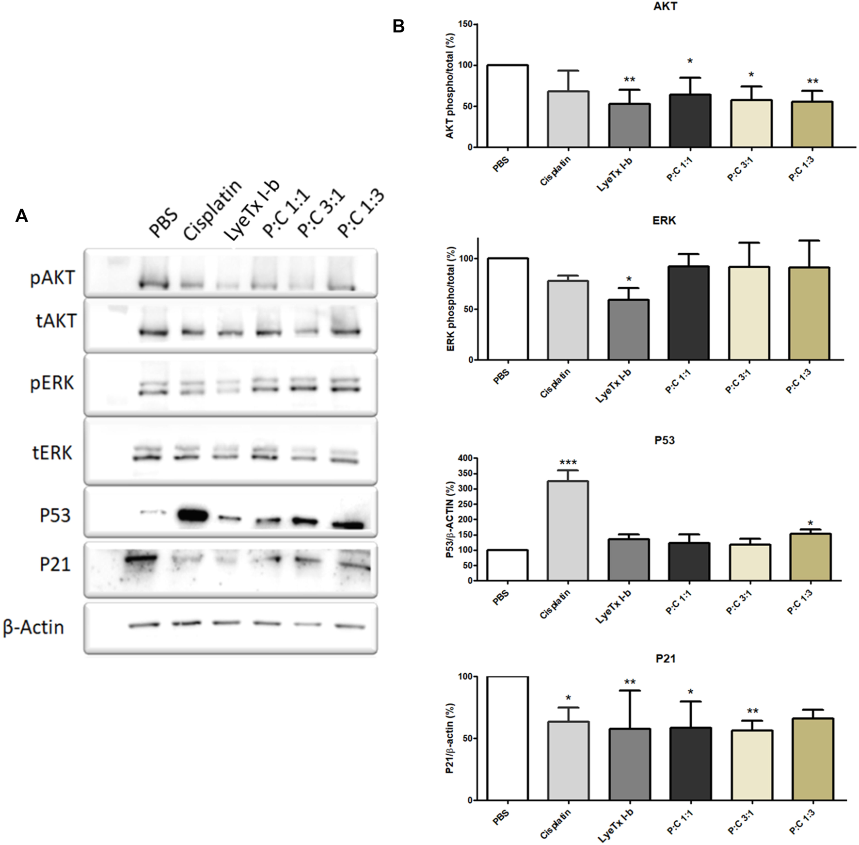 Immunoblots showed a decrease of AKT phosphorylation in the LyeTx I-b and combined treatments groups, as well as a reduction of P21 expression in all treatments. On the other hand, ERK phosphorylation decreased after LyeTx I-b treatment, and P53 was increased in the groups treated with cisplatin and a combination of P:C (1:3) (Figures 7A,B).