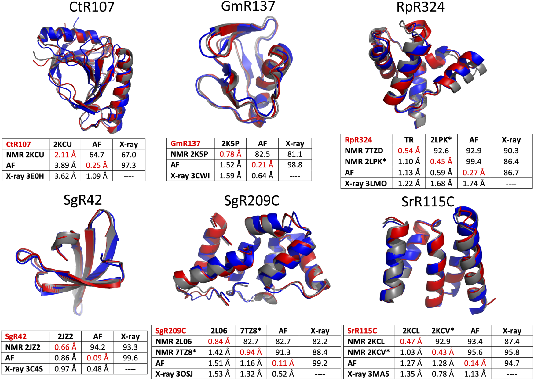 FIGURE 5. Comparison of AlphaFold, NMR and X-ray crystallography models. Superimposed backbone structures of solution NMR structures (NMR, blue), X-ray crystal structures (X-ray, grey), and AlphaFold prediction models (AF, red) for six proteins selected from the NESG NMR/X-ray pairs database. Below each superimposition is a matrix of backbone structurally-similarity statistics. The upper diagonal provides GDT-TS scores, and the lower diagonal Cα backbone RMSDs. The diagonals (with values in red) are Cα RMSD’s within the corresponding superimposed conformer ensemble relative to the medoid conformer. These models are compared only for residues that are both “well-defined” in the NMR ensemble and “reliably predicted” in the AlphaFold models, as indicated in Table 1. For NMR and AF model ensembles, the coordinates of the medoid conformers are compared. For NMR structures refined with RDC data (i.e., targets RpR324, SgR209C, and SrR115C) the image provided is for the medoid conformer of the structure determined with these RDC data.