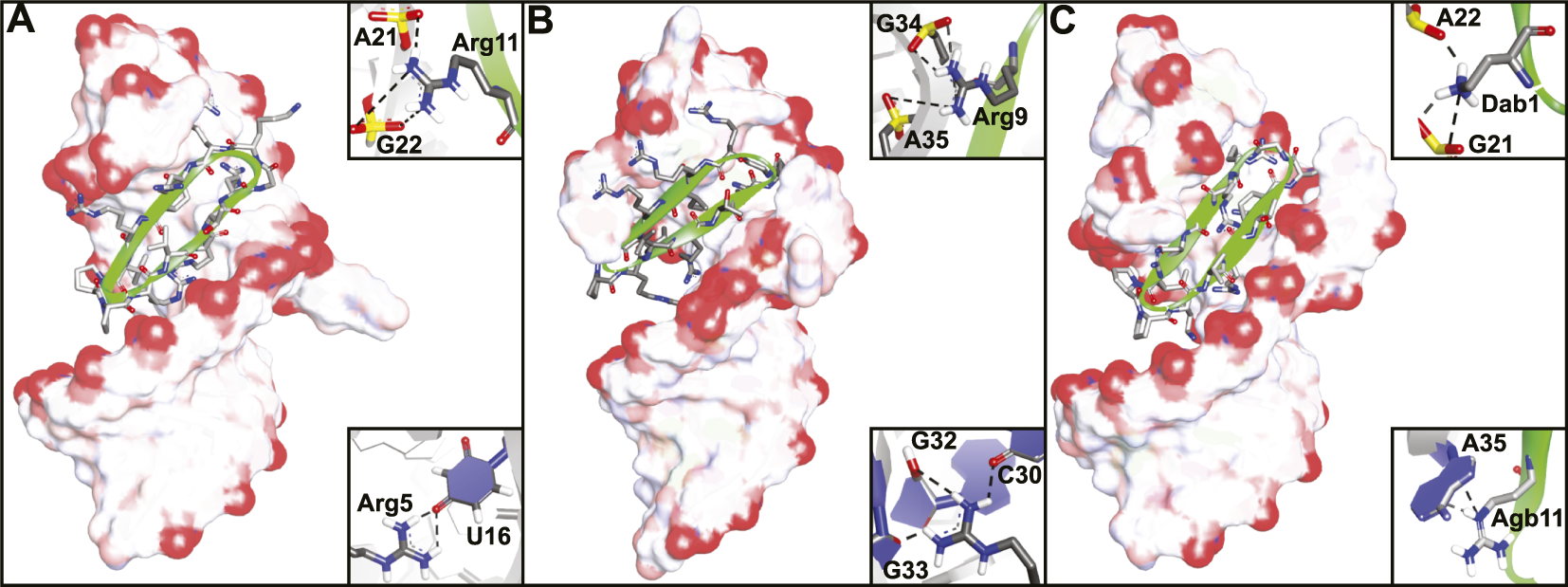 Some of the most potent RNA binding cyclic peptides have been identified as inhibitors of the bacterial ribosome (Poehlsgaard and Douthwaite, 2005; Polikanov et al., 2018). The ribosome synthesizes proteins by simultaneously decoding the incoming mRNA and catalyzing amide bond formation by connecting amino acids loaded onto transfer RNA (tRNAs). The ribosome consists of ribosomal proteins but also for a large part of ribosomal RNA (rRNA) which forms the target for several cyclic peptide antibiotics (Nissen et al., 2020). Binding of antibiotic peptides to the ribosome blocks bacterial protein synthesis leading to reduced cell growth and potentially cell death. The availability of several high-resolution crystal structures of the bound peptides makes these antibiotics an interesting case to learn how peptides bind RNA. However, it has to be noted that the ribosome forms a unique RNA target due to its highly stable fold which is more comparable to a protein target than other types of RNA. Still the types of interactions involved can be informative in the design of RNA targeting peptides.