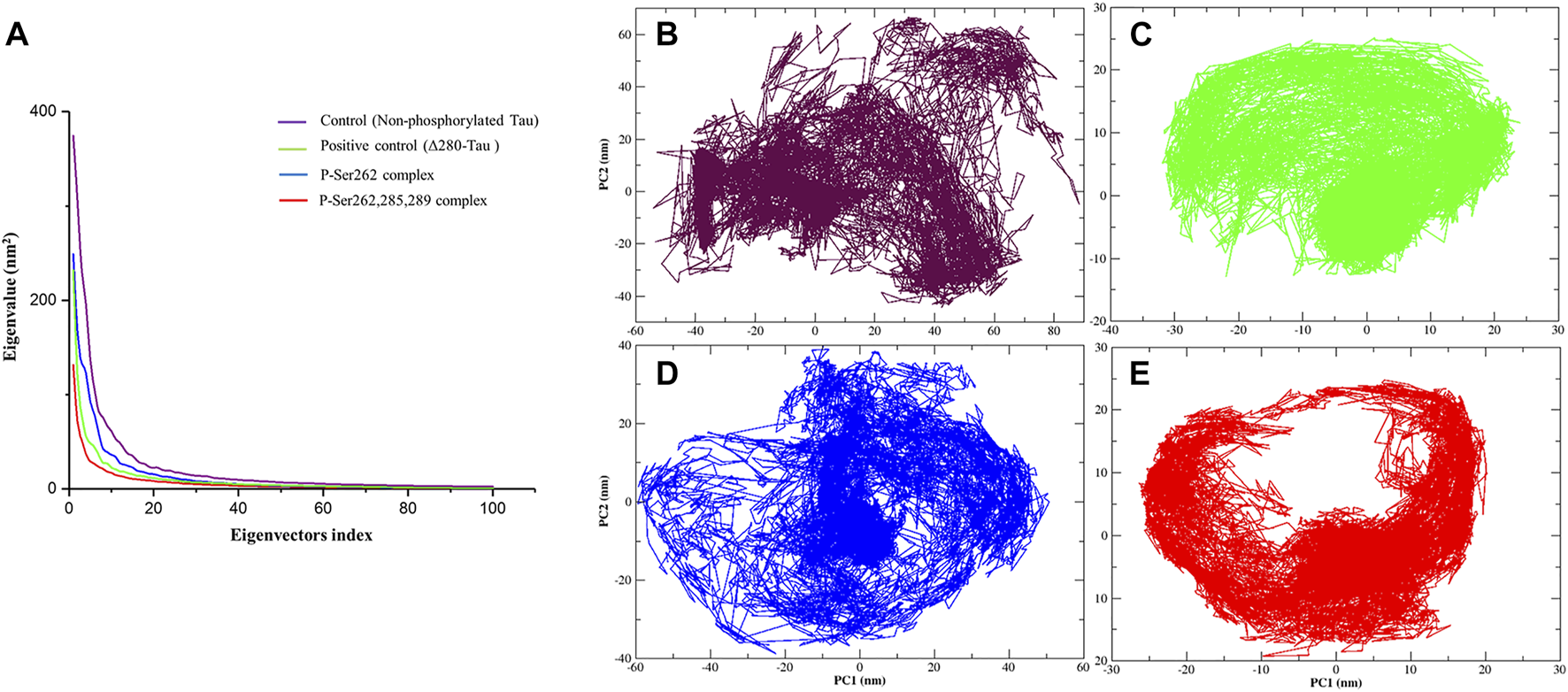 FIGURE 5. Principal component analysis (PCA) of the Cα atomic fluctuations in the control (non-phosphorylated tau), positive control (Δ280-tau), and the complexes with one (P-Ser262) and three (P-Ser262, 285, and 289) phosphorylated sites during 200 ns simulations. (A) Eigenvalues were plotted against the eigenvectors. Projections of the trajectory of (B) control and (D) P-Ser262 showed more changes compared to (C) positive control and (E) P-Ser262, 285, 289.
