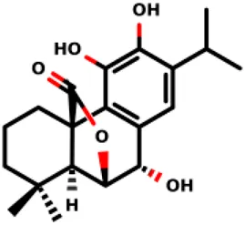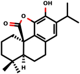 (1R,8S,9S,10S)-3,4,8-trihydroxy-11,11-dimethyl-5-(propan-2-yl)-16- oxatetracyclo [7.5.2.01,10.02,7]hexadeca-2 (7),3,5-trien-15-one | 12.9 ± 3.4 5.7 ± 2.1 | E. coli and S. aureus | Funes Chabán et al., (2021) |