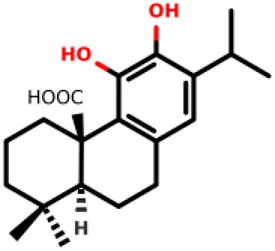 (4aR,10aS)-5,6-dihydroxy-1,1-dimethyl-7-(propan-2-yl)-1,2,3,4,4a,9,10,10a-octahydrophenanthrene-4a-carboxylic acid | 25.1 ± 6.5 12.3 ± 2.5 | E. coli and S. aureus | Funes Chabán et al., (2021) |