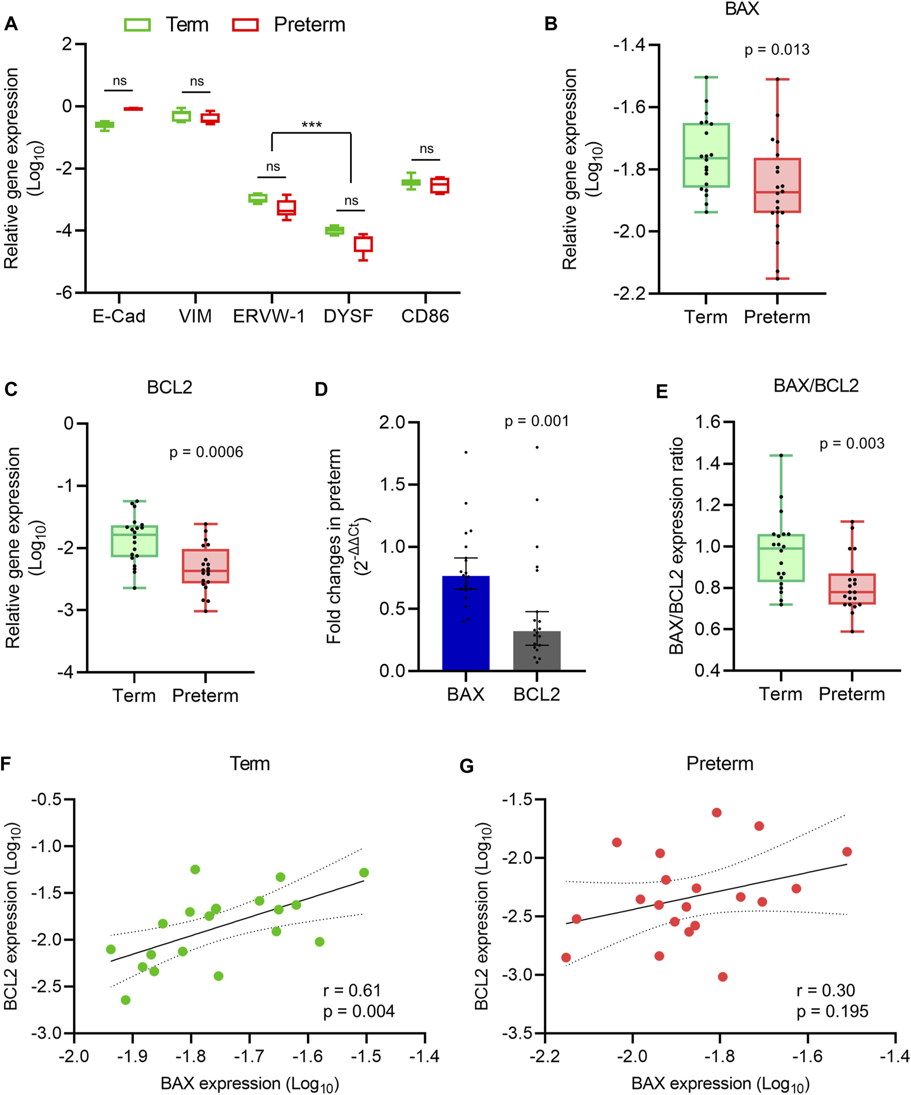 Apoptosis gene expression analysis. (A) Box plot of qRT-PCR analysis showing various cell-specific gene expressions (relative to GAPDH) in villous tissue of term and preterm placentas (n = 6 term and six preterm); ***p < 0.001; Two-way ANOVA with Tukey’s post hoc analysis. (B,C) Box plots of qRT-PCR analysis showing gene expression (relative to GAPDH) of BAX(B) and BCL2(C) in term and preterm placentas. (D) Fold-changes (Relative to term, 2-∆∆Ct) in the BAX and BCL2 gene expression in preterm placenta compared to term placenta. (E) Ratio between BAX and BCL2 gene expression in term and preterm placentas. (F,G) Spearman Rank test correlation analysis between BAX and BCL2 gene expression in the term (F) and preterm (G) placentas. Dotted lines represent 95% CI bands of the best-fit lines (Solid). n = 20 term and 20 preterm (B–G); ns = not significant. Mann-Whitney U test (B–E). Box plots data are presented as median and interquartile ranges (IQR) with minima and maxima. Each dot indicates an individual subject (B–G).