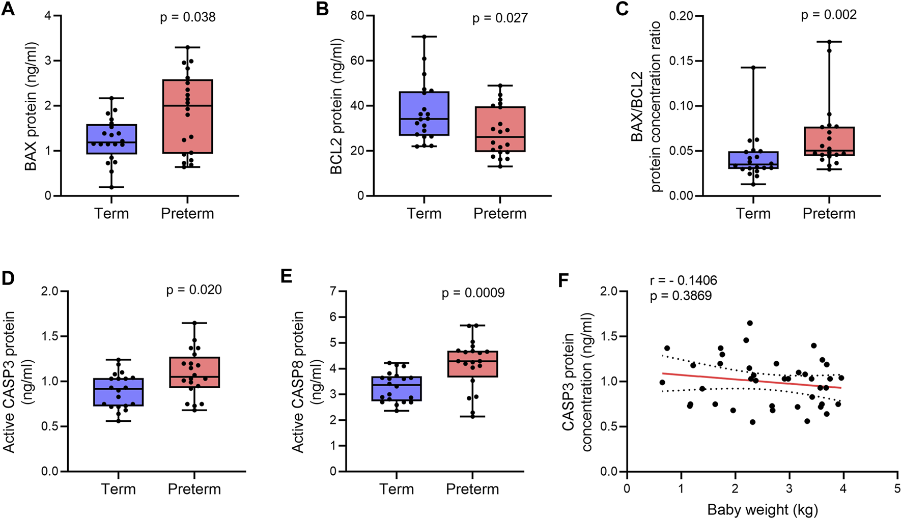 Quantification of apoptotic proteins. (A,B) Box plots of ELISA assays for BAX (A) and BCL2 (B) showing protein concentrations in term and preterm villous placenta tissue lysates. (C) Box plot showing ratio between BAX and BCL2 protein concentrations in term and preterm placentas. (D,E) Box plots of ELISA assays showing active CASP3 (D) and CASP8 (E) concentrations in term and preterm placentas. Total protein load was at 300 μg/ml for each sample. n = 20 term and 20 preterm (A–E). Data are presented as median and IQR with minima and maxima. Mann-Whitney U test. (F). Spearman Rank test correlation analysis between CASP3 protein concentrations and baby birth weights on the entire cohort (n = 40). Dotted lines represent 95% CI bands of the best-fit lines (Solid).