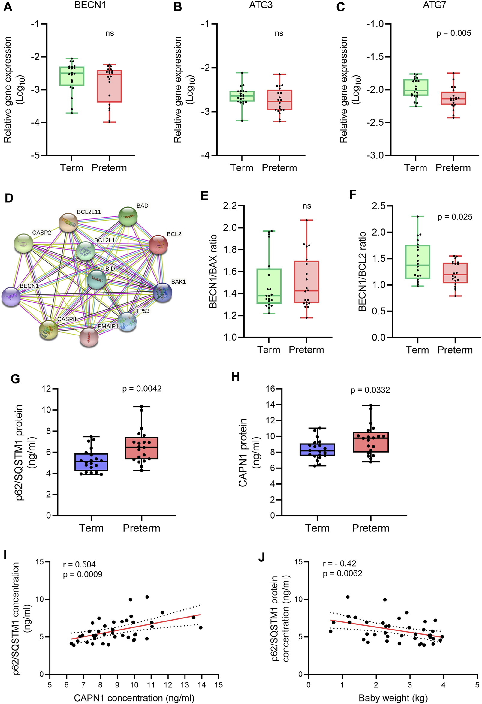 Autophagy gene and protein expression analysis. (A-C) Box plots of qRT-PCR analysis showing gene expression (Relative to GAPDH) of BECN1, ATG3 and ATG7 in term and preterm placentas. n = 20 term and 20 preterm. Data are presented as median and IQR with minima and maxima. Each dot represents individual subject. (D) STRING protein-protein interaction analysis (STRING, Version 11.5). (E,F) Ratio of gene expression of BECN1 and BAX (E), and BECN1 and BCL2 (F) in term and preterm placentas. n = 20 term and 20 preterm. Data are presented as median and IQR with minima and maxima (G,H). Box plots showing ELISA assay of p62/SQSTM1 (G) and CAPN1 (H) on term and preterm villous placenta tissue lysates. Total protein load at 300 μg/ml for each sample. n = 20 term and 20 preterm. Data are presented as median and IQR with minima and maxima. (I) Spearman Rank test correlation analysis between p62/SQSTM1 and CAPN1 protein concentrations on the entire cohort (n = 40). J. Spearman Rank test correlation analysis between p62/SQSTM1 protein concentrations and baby birth weights on the entire cohort (n = 40). Dotted lines represent 95% CI bands of the best-fit lines (Solid). ns = not significant, Mann-Whitney U test (A–H).