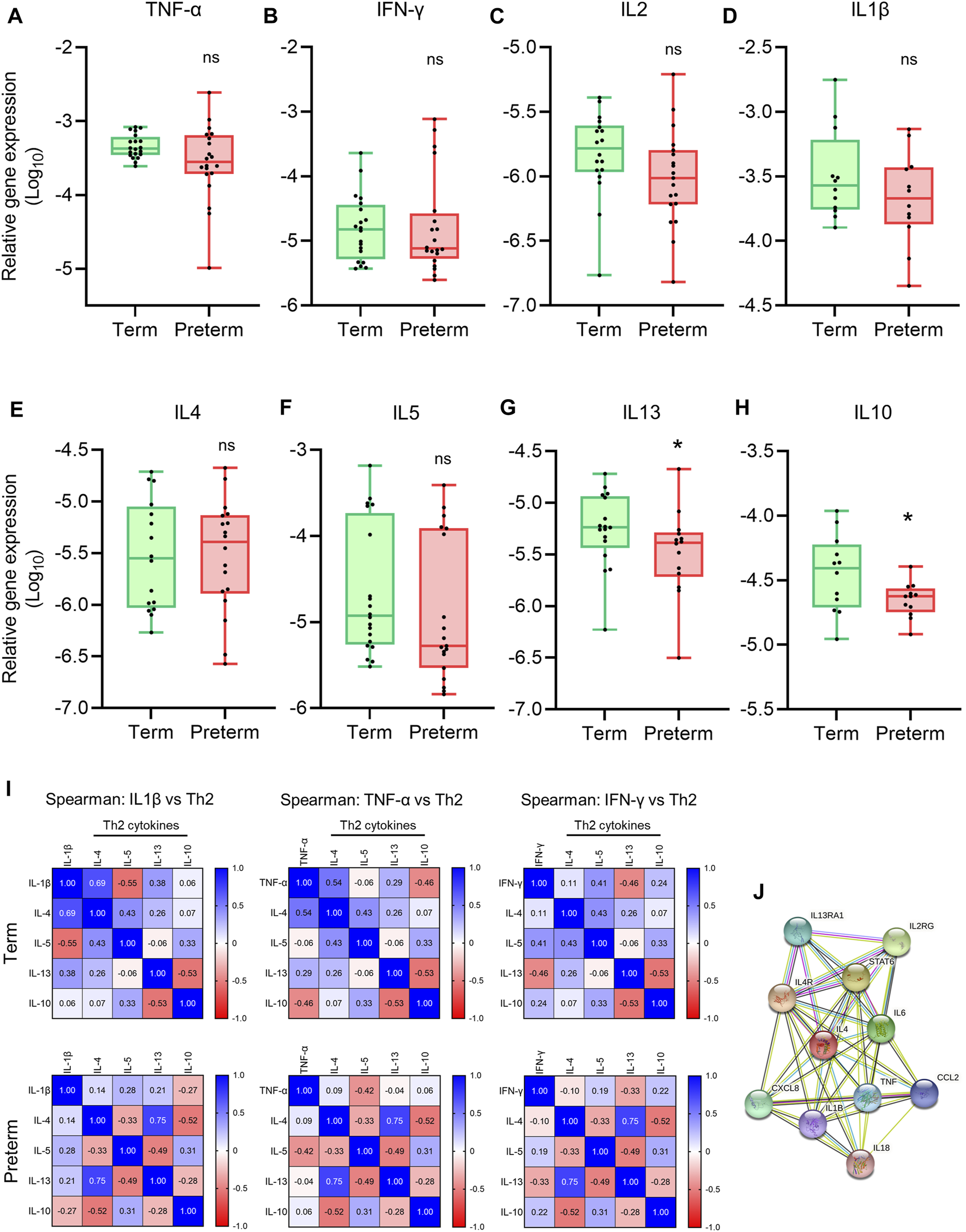 Th1 and Th2 gene expression and correlation analysis. (A-H) Box plots of qRT-PCR analysis showing gene expression (Relative to GAPDH) of Th1 cytokines (A–D) and Th2 cytokines (E–H) in term and preterm placentas. n = 20 term and 20 preterm (A-C and E-G), and n = 12 term and 12 preterm (D,H). Data are presented as median and IQR with minima and maxima. Each dot represents an independent subject. *p < 0.05, ns = not significant, Mann-Whitney U test. (I) Spearman Rank test correlation matrices of Th1 cytokines IL1β, TNF-α and IFN-γ vs Th2 cytokines IL4, IL5, IL13 and IL10 in term (upper panel) and preterm (lower panel) placentas. The numerical value in each small squire represents Spearman correlation coefficient ‘r’. (J) STRING protein-protein interaction analysis (STRING, Version 11.5).
