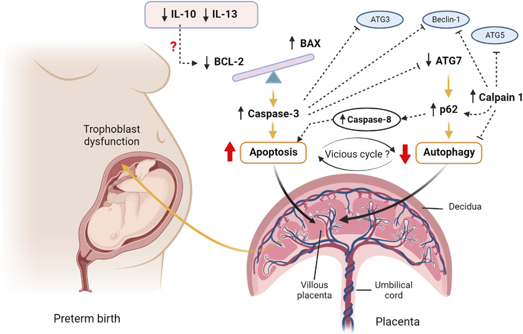 A proposed hypothesis of apoptosis and autophagy interactions in preterm birth. The imbalanced BAX/BCL2 expression in the preterm villous placenta increases the release of Caspase 3 and augments intrinsic pathway of apoptosis. The upstream downregulation of IL10 may potentiate downregulation of BCL2 expression leading to BAX/BCL2 imbalance. Caspase 8 is also activated as an indicator of potential extrinsic apoptotic pathway activation. On the other hand, the downregulation of autophagy gene ATG7 results in accumulation of p62 cargo protein within the villous tissue which inhibits the net autophagy flux. The high level of p62 favours accumulation of effector caspases, including Caspase 8 and executes apoptosis. The aggregation of caspases including Caspase 3 degrades essential autophagy-associated proteins, such as Beclin 1, ATG3 and ATG7, which consequently inhibits autophagy. Calpain 1 cleaves ATG5 and Beclin 1 and facilitates accumulation of p62 resulting in net inhibition of autophagy flux. Thus, a vicious cycle may potentially be established between apoptosis and autophagy via the reciprocal stimulatory actions of caspases and p62 within the preterm villous placenta that may have a pathognomonic effect on PTB. The figure is created with BioRender.com.