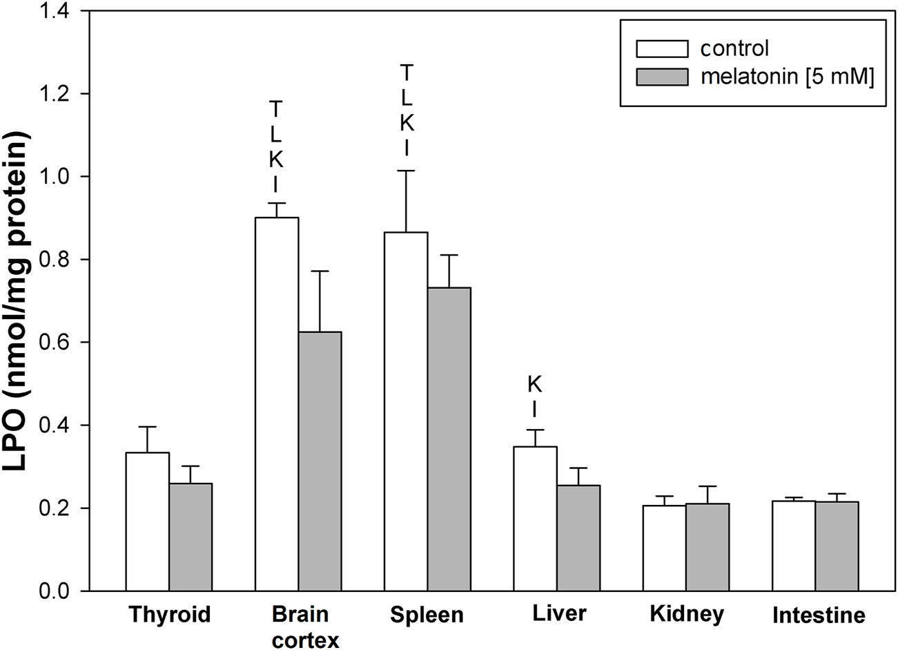 Concentrations of lipid peroxidation products (MDA+4-HDA) in the homogenates of porcine tissues (thyroid, brain cortex, spleen, liver, kidney, and intestine) incubated without any substance (control; white bars) or with melatonin (5 mM) (gray bars). T–p < 0.05 vs. respective control in the thyroid; L–p < 0.05 vs. respective control in the liver; K–p < 0.05 vs. respective control in the kidney; I–p < 0.05 vs. respective control in the intestine. Differences in LPO levels between control and melatonin are not statistically significant in particular tissues. Statistical differences between particular tissues after melatonin exposure are not marked.