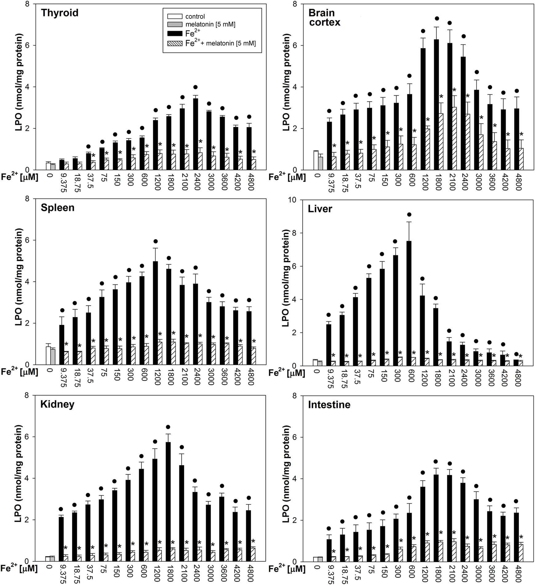 Concentrations of lipid peroxidation products (MDA+4-HDA) in the homogenates of porcine tissues (thyroid, brain cortex, spleen, liver, kidney, and intestine), incubated without any substance (control; white bars) or with melatonin (5 mM) (gray bars) or with Fe2+ (9.375, 18.75, 37.5, 75, 150, 300, 600, 1,200, 1,800, 2,100, 2,400, 3,000, 3,600, 4,200, and 4,800 µM) + H2O2 (5 mM) (black bars) or with Fe2+ (9.375, 18.75, 37.5, 75, 150, 300, 600, 1,200, 1,800, 2,100, 2,400, 3,000, 3,600, 4,200, and 4,800 µM) + H2O2 (5 mM) with melatonin (5 mM) (striped bars). p < 0.05 vs. respective control (without any substance); *p < 0.05 vs. Fe2+ in the same concentration. Statistical differences between Fe2++H2O2+melatonin (stripped bars) vs. melatonin (gray bars) in particular tissues are not marked.