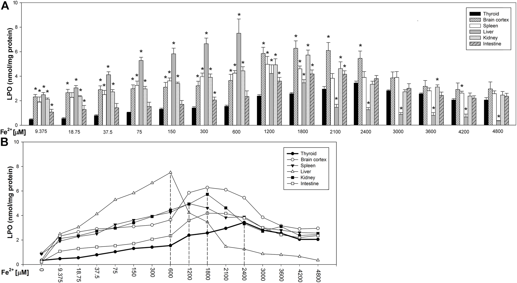 (A) Concentrations of lipid peroxidation products (MDA+4-HDA) in the homogenates of porcine tissues (thyroid, brain cortex, spleen, liver, kidney, and intestine), incubated with Fe2+ (9.375, 18.75, 37.5, 75, 150, 300, 600, 1,200, 1,800, 2,100, 2,400, 3,000, 3,600, 4,200, and 4,800 µM) + H2O2 (5 mM). *p < 0.05 vs. respective concentration in the thyroid. (B) Line graph representing concentrations of lipid peroxidation products (MDA+4-HDA) in the homogenates of porcine tissues (thyroid, brain cortex, spleen, liver, kidney, and intestine), incubated with Fe2+ (9.375, 18.75, 37.5, 75, 150, 300, 600, 1,200, 1,800, 2,100, 2,400, 3,000, 3,600, 4,200, and 4,800 µM) + H2O2 (5 mM). Vertical dashed lines indicate that iron concentration at which the LPO peak occurs for each individual tissue. Data points represent mean values of independent experiments analogically to results presented in Figure 3.