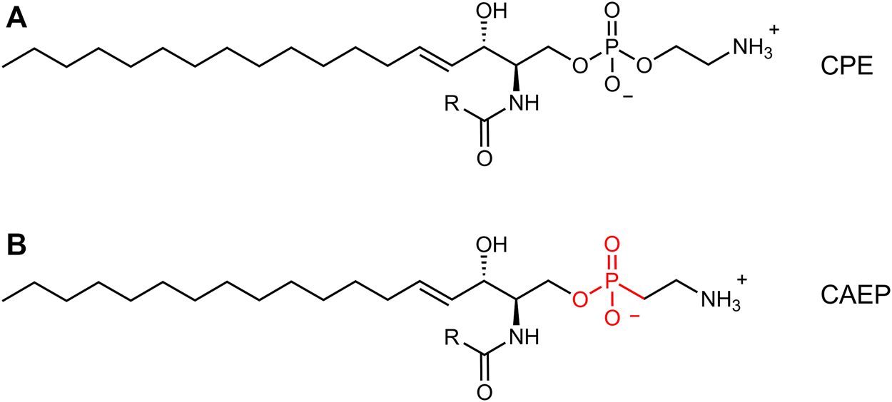 Comparison between canonical ceramide phosphoethanolamine (CPE, (A) and ceramide aminoethylphosphonate (CAEP, (B). The latter bears a phosphonate headgroup instead of a phosphate group.