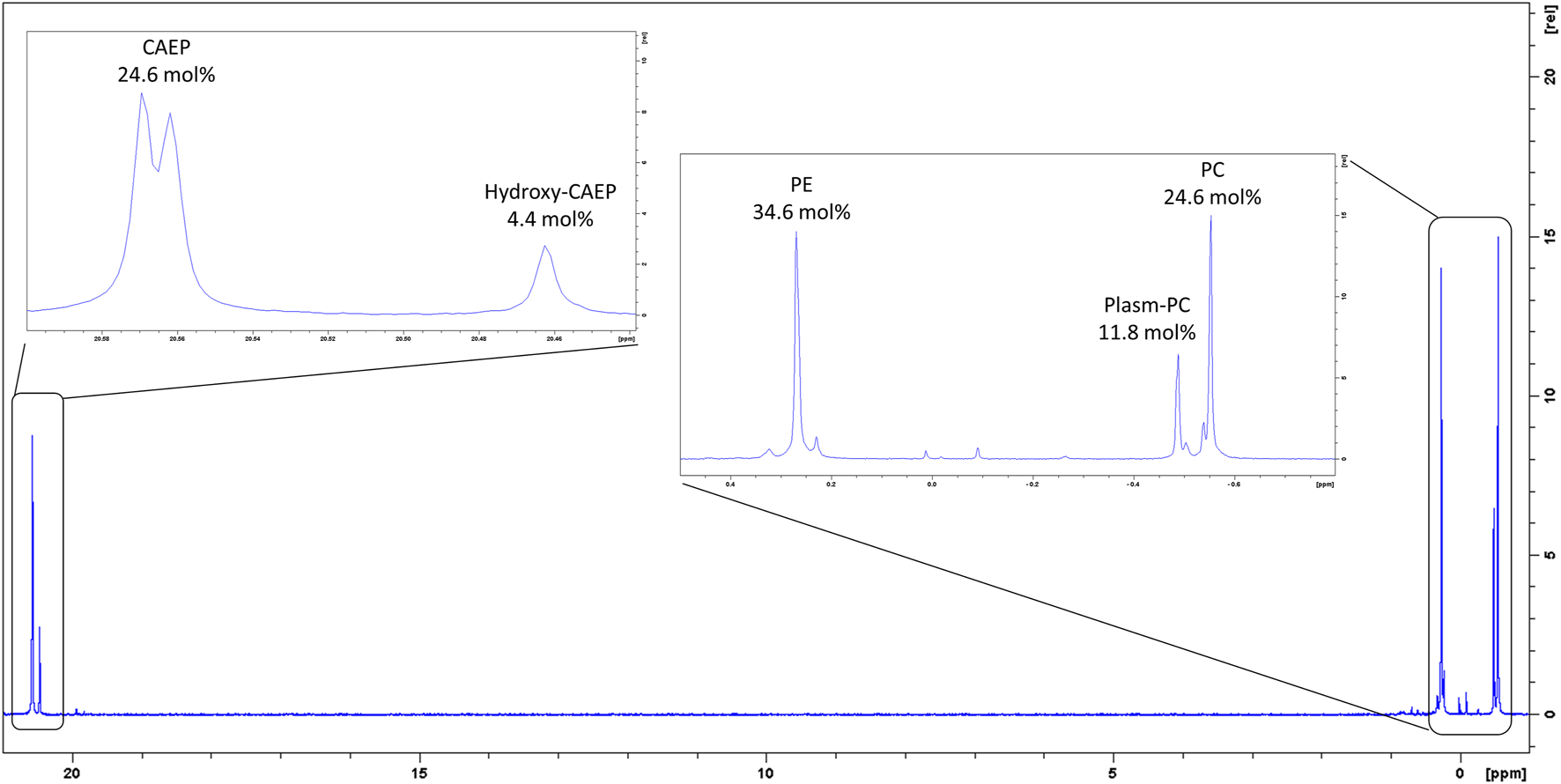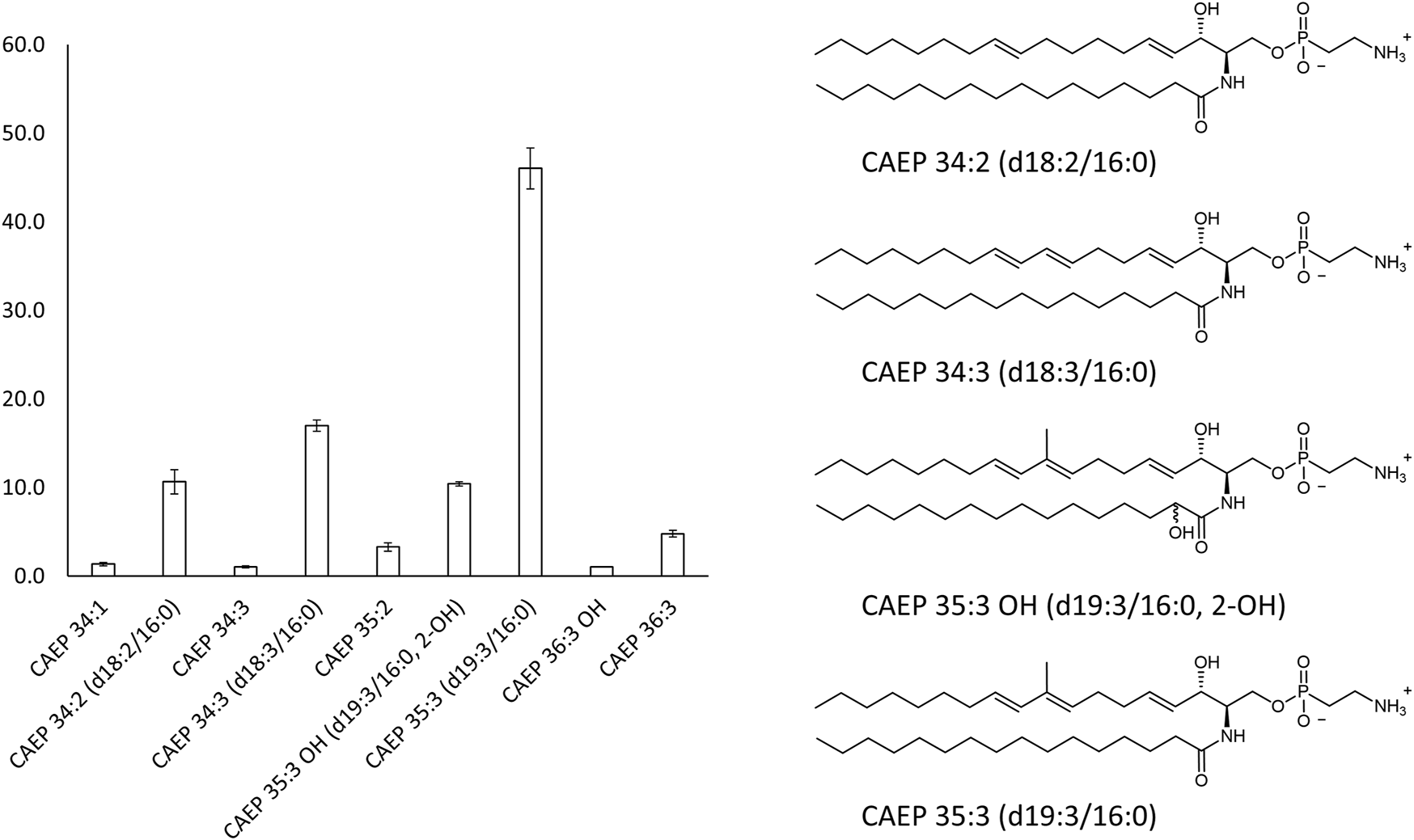 The overall profile of CAEP in term of sphingosine/amide chain lengths and unsaturation was then established by liquid chromatography mass-spectrometry (LC-MS) and LC-MS-MS measurements. The most abundant CAEP species present in the raw extract were (Figure 3): CAEP 35:3 OH ((= CAEP d19:3/16:0, 2-OH), 10 mol%); CAEP 34:3 ((= CAEP d18:3/16:0), 18 mol%); CAEP 35:3 ((= CAEP d19:3/16:0), 47 mol%) and CAEP 34:2 ((= CAEP d18:2/16:0), 11 mol%). Minor CAEP lipids, including species bearing an N-methyl-amino, were also found, but their abundance did not exceed 3 mol%.
