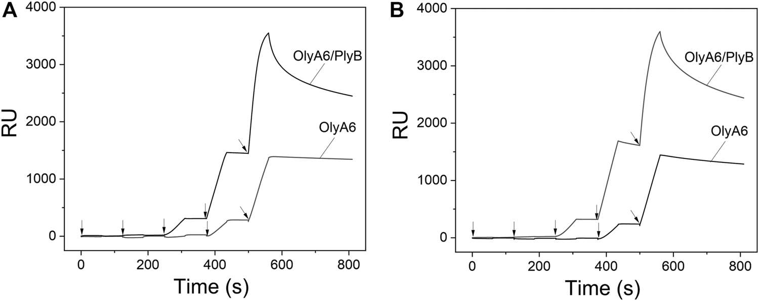 Binding of OlyA6 and OlyA6/PlyB (12.5/1, molar ratio) to immobilized equimolar CAEP/POPC/Chol (A) and CPE/POPC/Chol (B) large unilamellar vesicles using the kinetic titration approach in a single cycle by successive injections of 0.03, 0.06, 0.12, 0,25, and 0.5 μM (from left to right) concentration. Vesicles were immobilized on the Biacore L1 chip to approximately 8,000 response units (RU). Representative sensorgrams from two independent experiments are shown. CPE-ceramide phosphoethanolamine, Chol-cholesterol, POPC-1-palmitoyl-2-oleoyl-sn-glycero-3-phosphocholine, CAEP-ceramide aminoethylphosphonate.