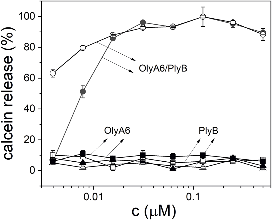 Concentration dependence of permeabilization of equimolar CAEP/POPC/Chol (full symbols) and CPE/POPC/Chol (open symbols) small unilamellar vesicles by OlyA6/PlyB. OlyA6/PlyB molar ratio = 12.5/1. Individual proteins, OlyA6 and PlyB, were also tested as controls. CPE-ceramide phosphoethanolamine, Chol-cholesterol, POPC-1-palmitoyl-2-oleoyl-sn-glycero-3-phosphocholine, CAEP-ceramide aminoethylphosphonate.