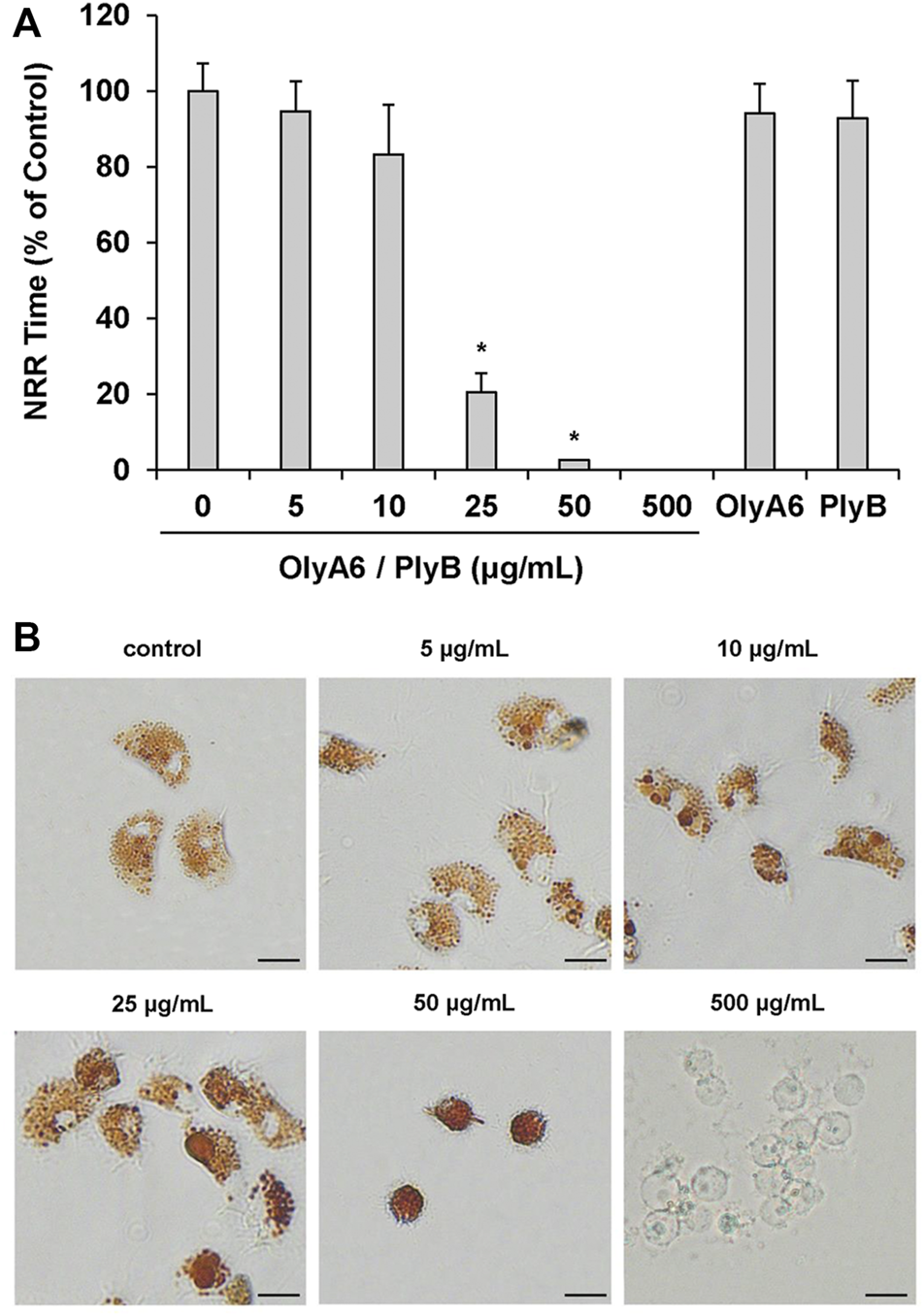 Effects of the OlyA6/PlyB mixture on lysosomal membrane stability of M. galloprovincialis hemocytes. Hemocytes were exposed to different concentrations of the mixture (5, 10, 25, 50, 500 μg/ml; OlyA6/PlyB molar ratio 12.5/1) and to OlyA6 (25 μg/ml) or PlyB alone (2 μg/ml). (A) Data, reported as percent values of neutral red retention time with respect to controls, representing the mean ± SD of four experiments in triplicate, were analysed by the Mann Whitney U test. *p < 0.01. (B) Representative images of hemocytes treated with different concentrations of the protein mixture, as indicated. NRR–neutral red retention time. Scale bar = 10 μm.