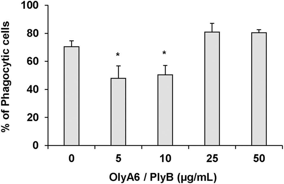 Effects of the OlyA6/PlyB mixture on phagocytic activity of M. galloprovincialis hemocytes. Hemocytes were exposed to different concentrations of the protein mixture (5, 10, 25, 50 μg/ml; OlyA6/PlyB molar ratio 12.5/1). Data, representing the mean ± SD of four experiments in triplicate, were analysed by the Mann Whitney U test. *p < 0.01.