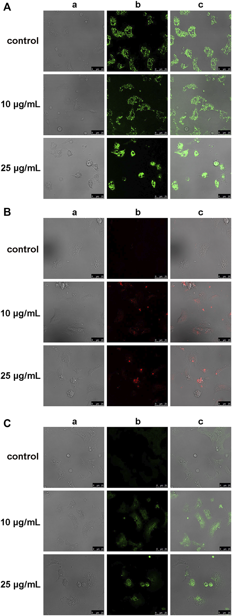 Effects of the OlyA6/PlyB mixture on mitochondrial and oxidative stress parameters in M. galloprovincialis hemocytes evaluated by confocal laser scanning microscopy. Representative images of hemocytes exposed to different concentrations of the OlyA6/PlyB mixture at the OlyA6/PlyB molar ratio 12.5/1 and loaded with (A) tetramethylrhodamine ethyl ester (TMRE), for mitochondrial membrane potential; (B) MitoSOX Red for mitochondrial superoxide (O2) production; (C) CM-H2DCFDA (C-DCF), for generation of intracellular H2O2. Rows correspond to different concentrations of the OlyA6/PlyB mixture (0, 10 and 25 μg/ml). Columns show: (a) brightfield, (b) fluorescence signals of TMRE, MitoSOX and C-DCF (c) merged channels. Scale bar: 25 μm.