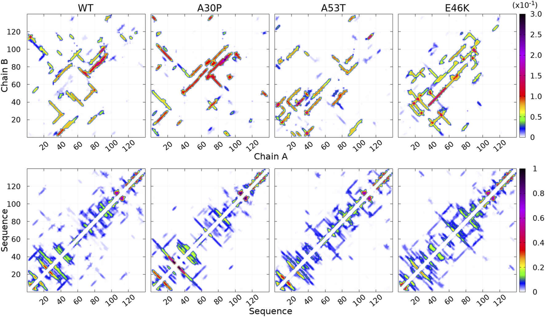 Contact maps computed for the complete ensemble of α-syn dimers found in molecular dynamics simulations for the WT and the mutants. The upper panels show intermolecular contacts between chains A and B of the dimers, and the lower panels show intra-molecular contacts within monomers A + B. The color bars indicate the probability. Note the different scales for intra- and intermolecular contact maps.