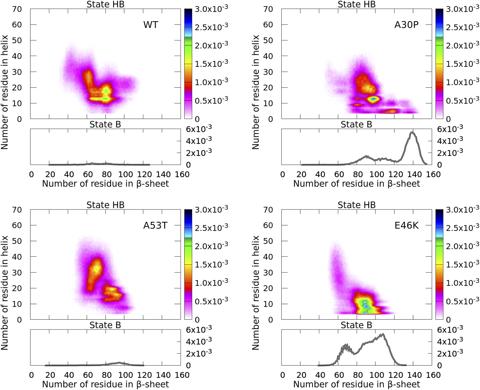 Probability density of the number of residues in α-helices and β-sheets for the WT and mutants of α-syn. The probability density of state B (no helix) is represented by a function (gray) (right vertical axis), and the probability density of state HB is represented by a two-dimensional map (right color bar).