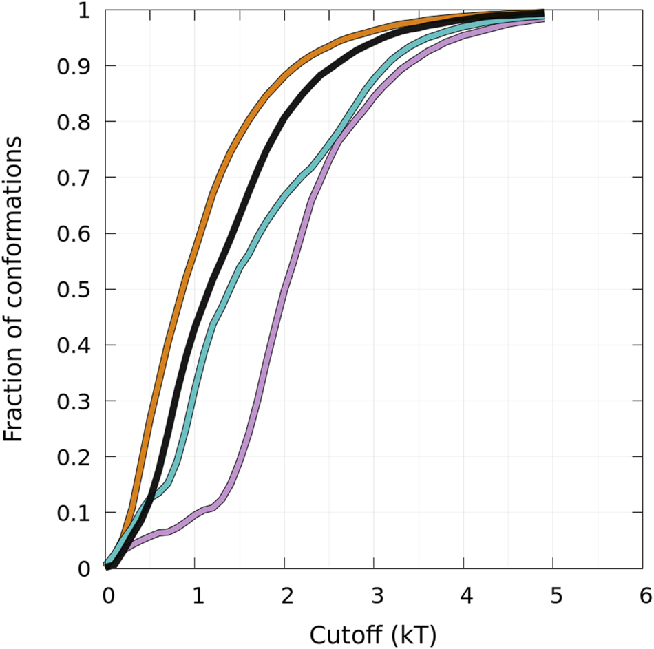 Cumulative fraction of the total number of conformations simulated as a function of an effective free-energy cut-off from the global minimum of the B state (see text) represented in Figure 4. The curves are for the WT (black), A30P (purple), E46K (turquoise), and A53T (orange).